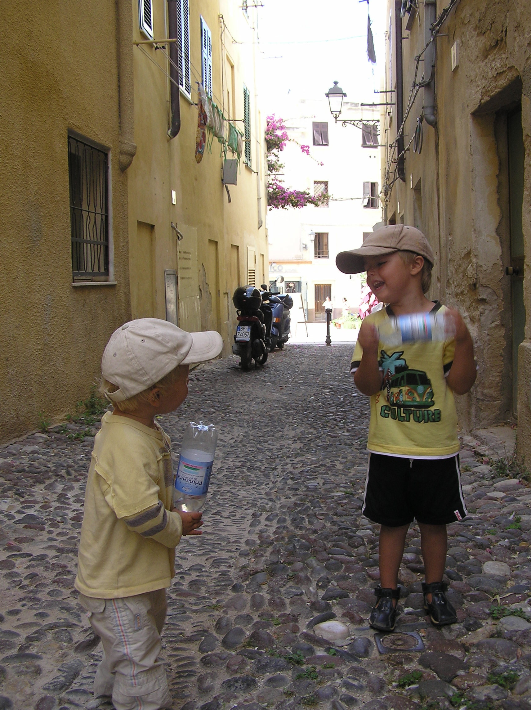 Alghero. Gamla stan. Härlig stadsmur. Trånga mysiga gränder. Tvätt på tork som det ”ska” vara i Itaien. Mat, glass och promenader. Fönstershopping. Paus. Varmt. Dricka vatten. Anton, 3 år: ”Kom Albin så spelar vi musik med vattenflaskorna.”