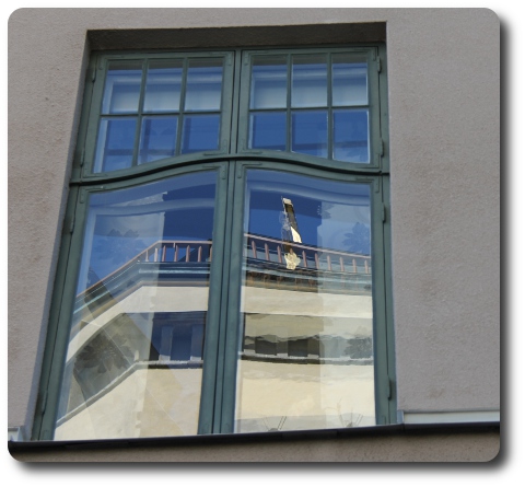 På de första två bilderna ser man byggnaden spegla sig i huset mitt emot.