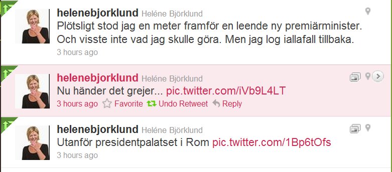 Jag tycker nog att det är uppenbart att hon så här långt twittrar betydligt mer begåvat än Peppe! Ändå följs han redan av fler. Det här är ganska typiskt för twitter. Kändisar har väldigt lätt att få ett snabbt genomslag på Twitter. Ju mer känd desto snabbare. Men det är inte den enda faktor som har betydelse. Och jag är övertygad om att Heléne snart har betydligt fler followers än de 65 som följer just nu. Jag har nominerat henna till Radio Blekinges tävling för att utse Blekinges bästa twittrare. Jag hoppas och tror att de tar ut henne till finalen och i så fall tror jag att hon snabbt kommer att få fler följeslagare på Twitter. Och redan hennes direktrapportering från Rom har nog satt en snöboll i rullning för hennes del. För oss vanliga dödliga tycker jag annars inte att det är just möjligheten att nå ut till många följare med 140 tecken långa budskap som är själva vitsen med Twitter. Vitsen är att det är så roligt att följa och småprata med många.