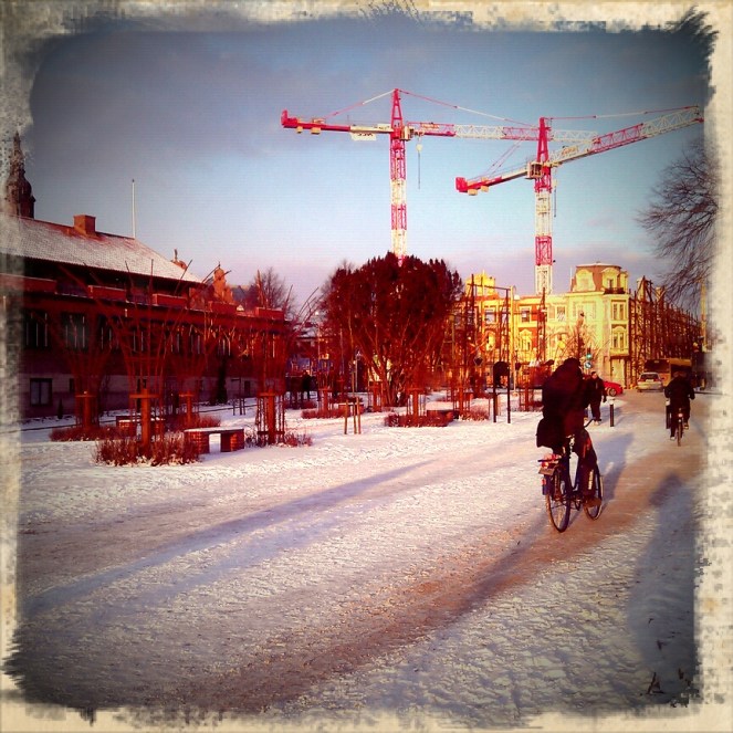 Intressant bild med kontrasten mellan snön och cyklisterna!