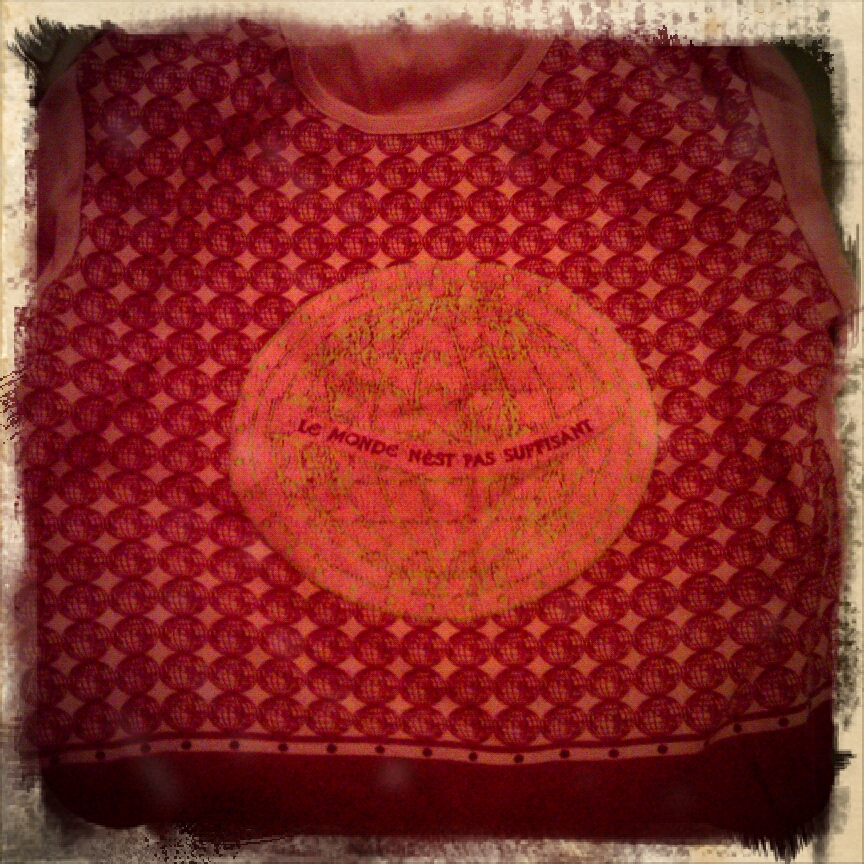 Jag har älskat den här långärmade t-shirten. ”Le monde n’est pas suffisant”, lyder den nu mera söndernötta texten. ”Världen är inte nog”, på svenska.