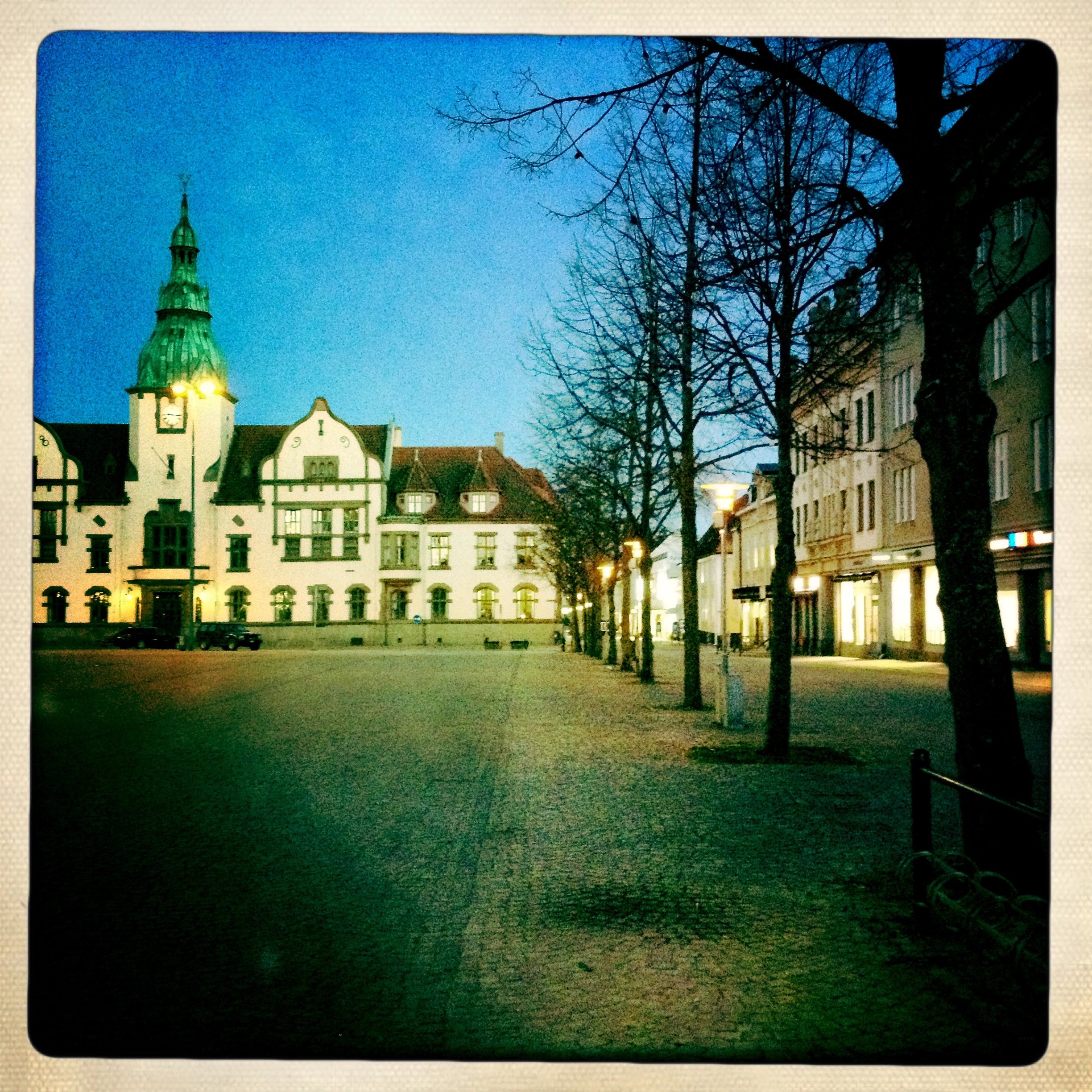 Som igår. När jag deklarerade upptäckte jag blanketter som hörde till mitt gamla jobb. Gick för att posta dem i rådhuset. I den blå timmen. Fotoögonblick.