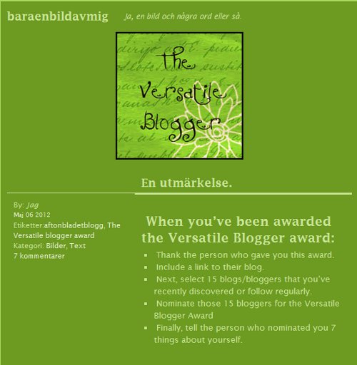 Åh! Såg precis att jag fått en bloggutmärkelse på min absoluta favoritblogg: baraenbildavmig. Klippet ovan ifrån blogginlägget ifråga.