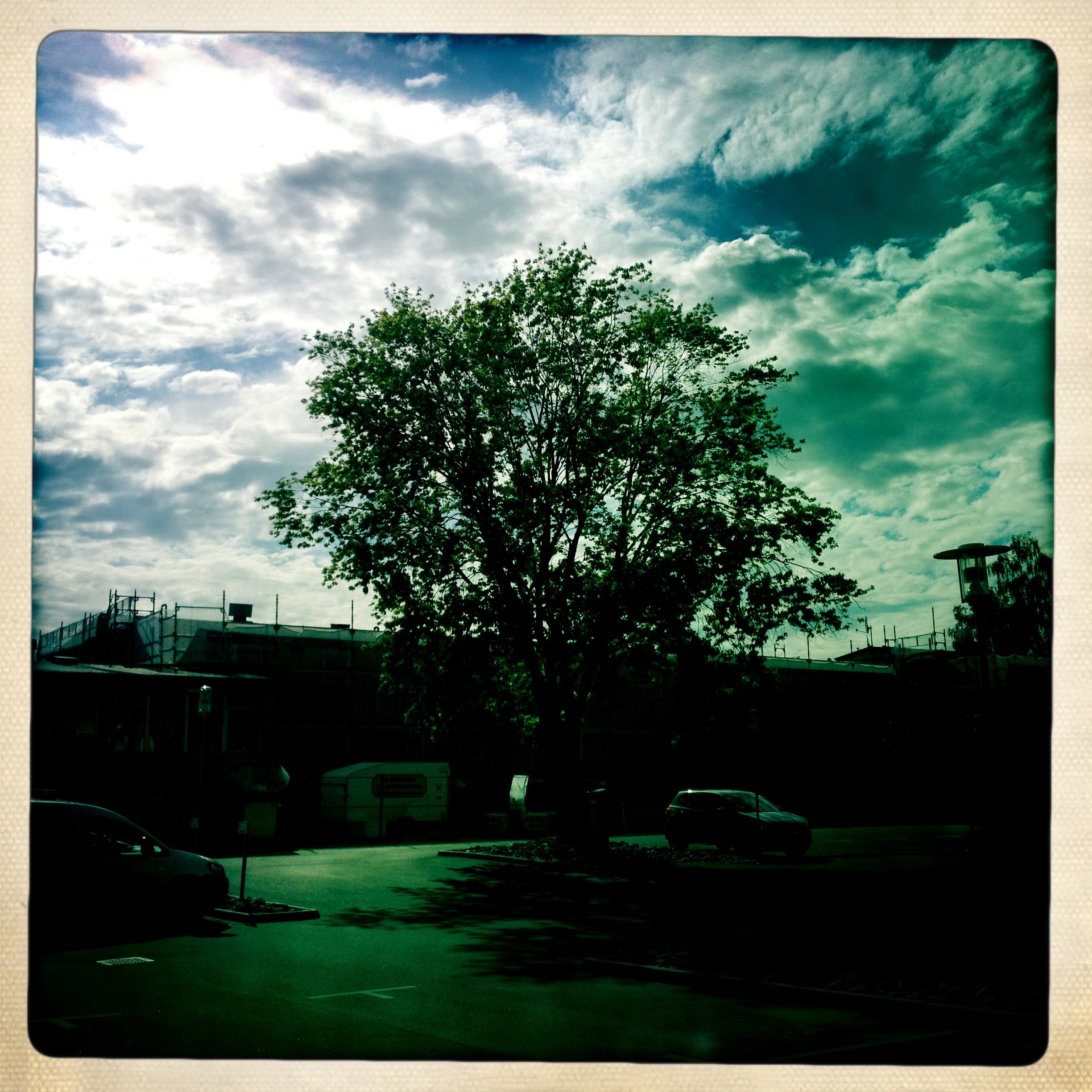 Bilden ovan är fotograferad enkom för det här blogginlägget. Jag lider av den sjukan att jag fotograferar för mycket. Ändå skulle jag normalt sett inte ha fotograferat en sådan bild. Parkeringsplatser och byggnadsställningar har den egenheten att de sällan är väldigt vackra.