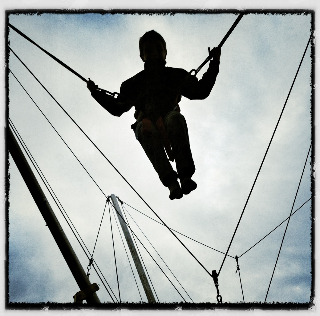 2. Häftig silhuettbild! Visst är det en sån där stor studsmatta med sele? En sån var jag tvungen att prova när vi var i Spanien och det var det närmaste att flyga i luften man kan komma. Vilken härlig känsla att kunna göra volter, precis som i drömmen!