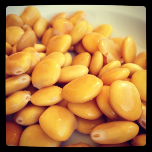 Som snacks äter vi en för oss ny sorts bönor. De är gula, fyrkantiga och smakar salt och gott. Man biter av skalen.