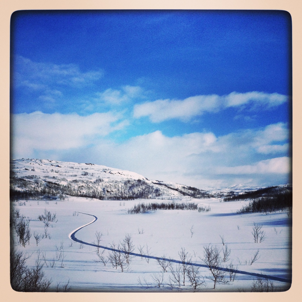 Så här fint var det igår när vi åkte med transferbussen från Riksgränsen till Björkliden. Men vädret slog om igår eftermiddag och idag är vi insnöade vid Riksgränsen. Transferbussen gick inte.