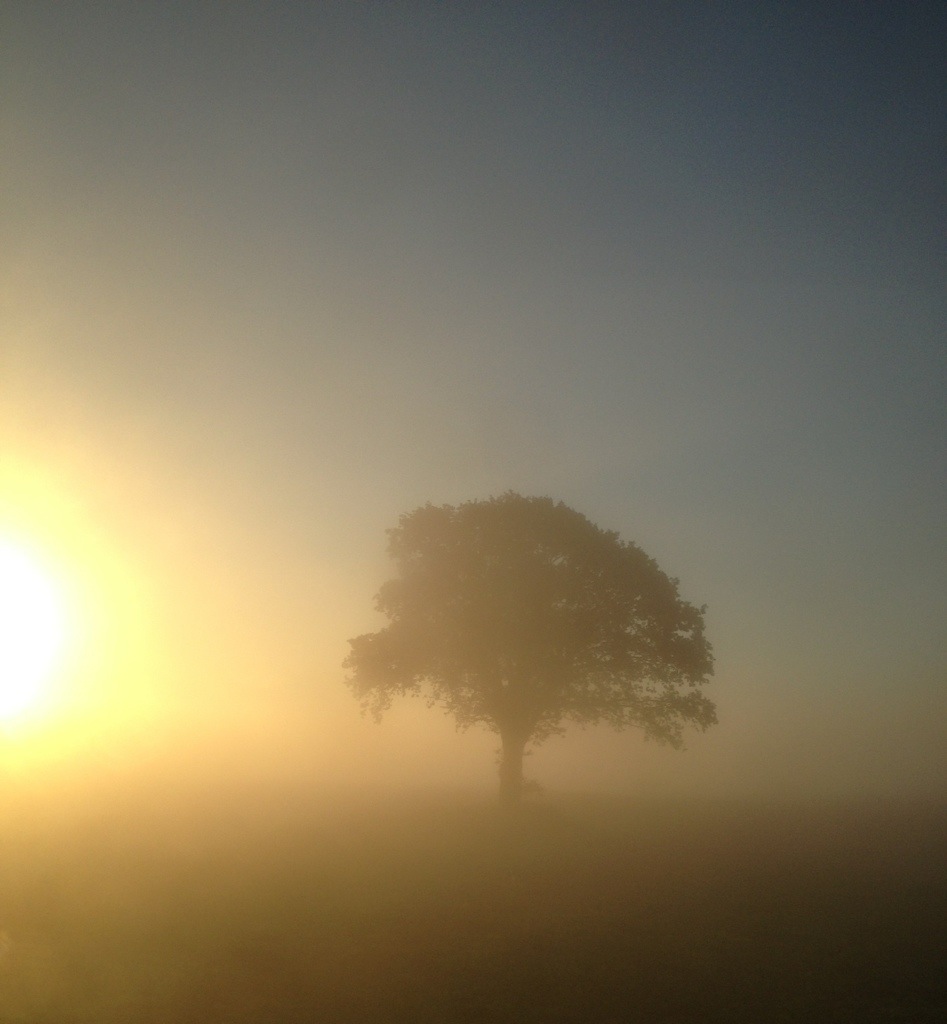 Träd i motljus och dimma.