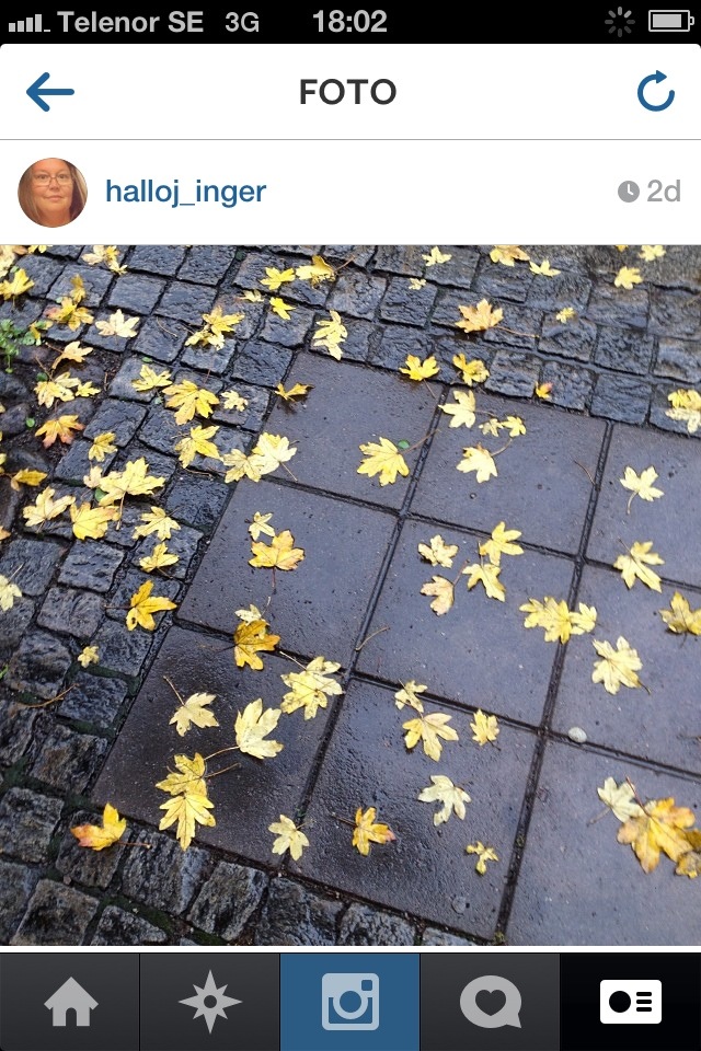 Jag tycker om att fotografera soluppgångsbilder på tågresan till jobbet men de bilderna börjar nu bli suddiga. Rörelseoskärpa kan i och för sig bli snyggt också och addera poesi till bilderna. Men betydligt oftare blir resultatet helt misslyckat. Och på väg hem från jobbet råder nu totalt mörker. Att hitta motiv de där fåtaliga timmarna när ljuset är på plats är också en utmaning nu när löven har fallit och himlen är grå. Lika bra att vända blicken nedåt och hänga med huvudet. Och se där! Några löv har alldeles själva bildat ett litet konstverk där på marken!