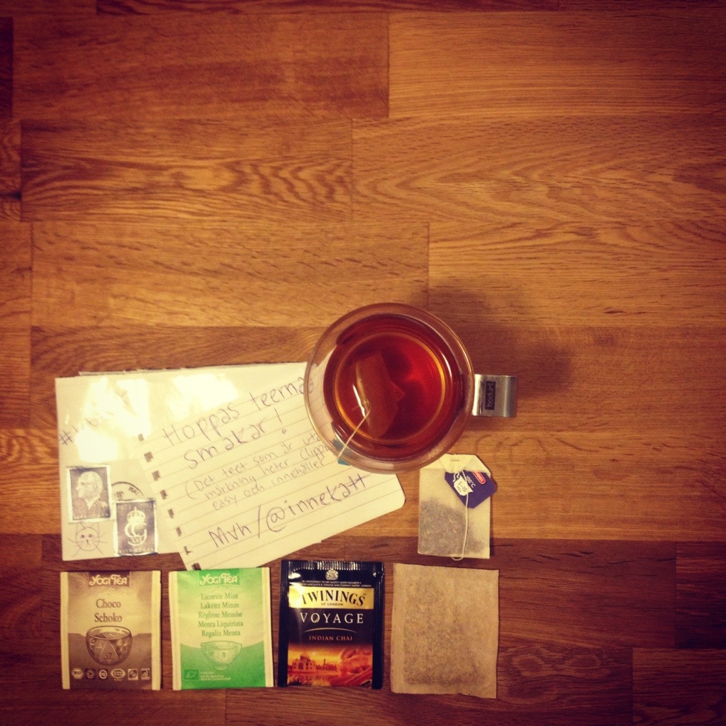 Det första teet jag smakade av de jag fick var Friggs Karibiska. Det smakade mycket gott! Sedan har jag druckit Twinings Voyage som är en gammal favorit för min del. Clipper sleap easy smakade också gott. Jag har också druckit Yogi Tea Choko som var en lite märklig upplevelse, men kul! Choklad och te på en och samma gång. Kvar att smaka är Friggs Blåbär och Yogi Tea mint & lakrits.