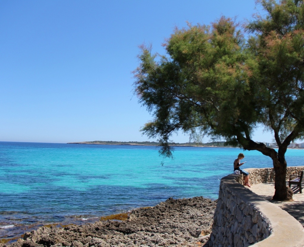 Någon sitter och läser under ett träd någonstans längs strandpromenaden mellan Cala Bona och Cala Millor.