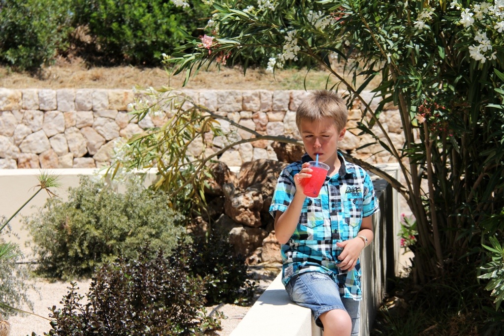 Anton dricker slush i hotellträdgården på Wing Resort i Cala Bona.