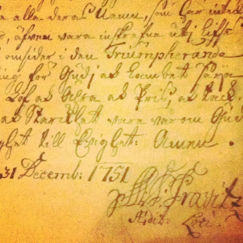 I en liten utställningsmonter finns några gamla skrifter. Bland annat ett sista blad ur en kyrkbok. Det är daterat den 31 december 1751. Då hade Petrus son Magnus redan tagit över jobbet som klockare i Dalby (det gjorde han 1749) men jag tycker nog att det ser ut som om det är Petrus som har undertecknat sidan: