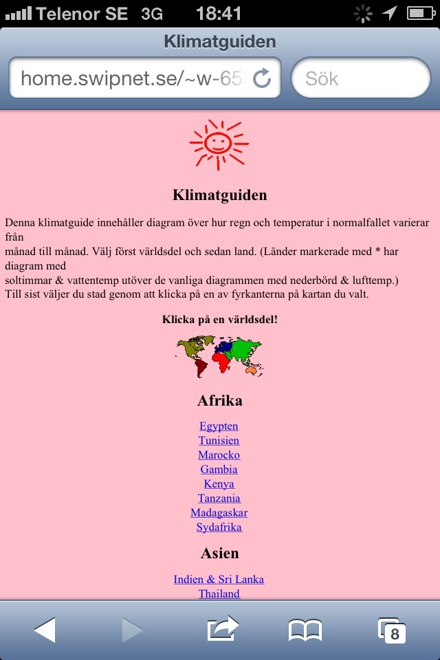 Världskartan var snodd från nån sida, redesignad i Paint och var klickbar på de olika världsdelarna. Allt kodat för hand i HTML.