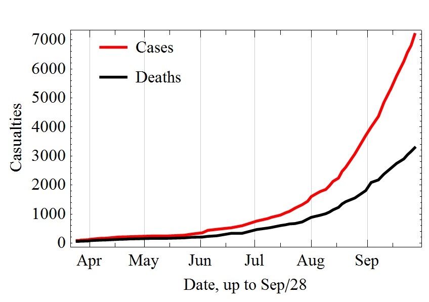 Uppdatering: Efter att ha hittat WHO:s sida med rapporter om ebolan är jag nu lite mer optimistisk om utvecklingen. Det tycks som att de senaste tre veckorna har antalet sjukdomsfall av Ebola slutat accelerera. Det betyder inte att antalet sjuka och döda slutat öka, men att antalet nya fall nu kanske ligger stilla runt ca 150 insjuknade per dag. Detta kan vara slutet på början av det utbrott som pågår. Jag tror att de närmaste veckorna och månaderna kommer att vara kritiska i kampen mot ebolan. Jag fortsätter att hålla tummarna.