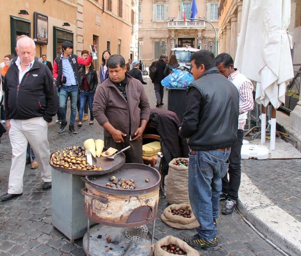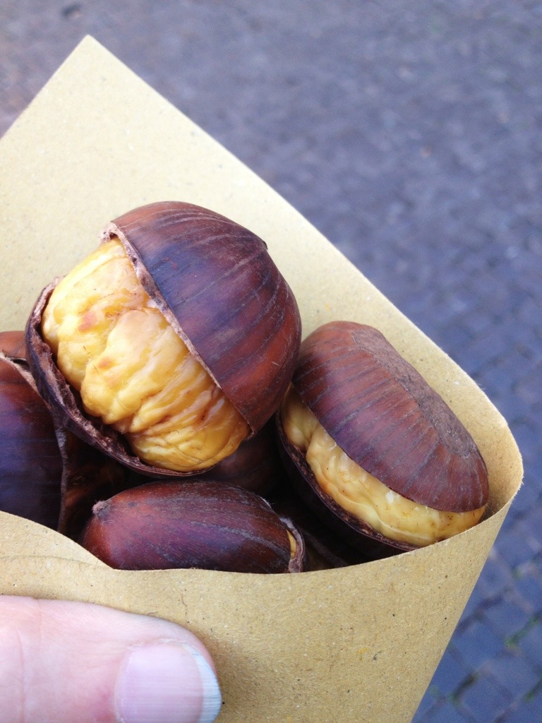 Om rostade kastanjer har jag läst många gånger. Men aldrig förut smakat. Här och var står de, försäljarna och rostar dem. Det doftar gott. Så jag bestämde mig för att smaka. Köpte tio kastanjer för fem euro. De smakade – ungefär som kokt potatis faktiskt – något nötaktig potatis.