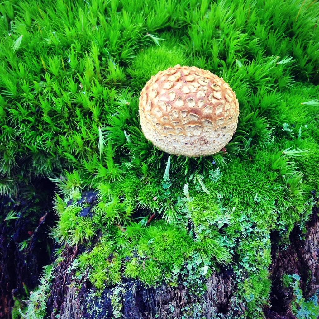 Sist en ensam liten svamp i den gröna mossan på en stubbe i skogen. Ser ut som en golfboll nästan. Vet du vad den kan heta?