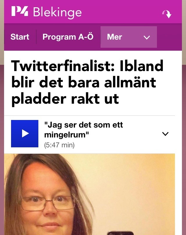 Blev inslaget bra? Det kändes som ett bra samtal där jag fick berätta om varför jag gillar Twitter: Jag ser det som ett mingelrum där man kan gå in och ut och småprata om ämnen som intresserar när man vill. Men lyssnat på inslaget. Det har jag inte. Och det ska jag nog inte heller. Brukar inte gilla att höra min egen röst. :)