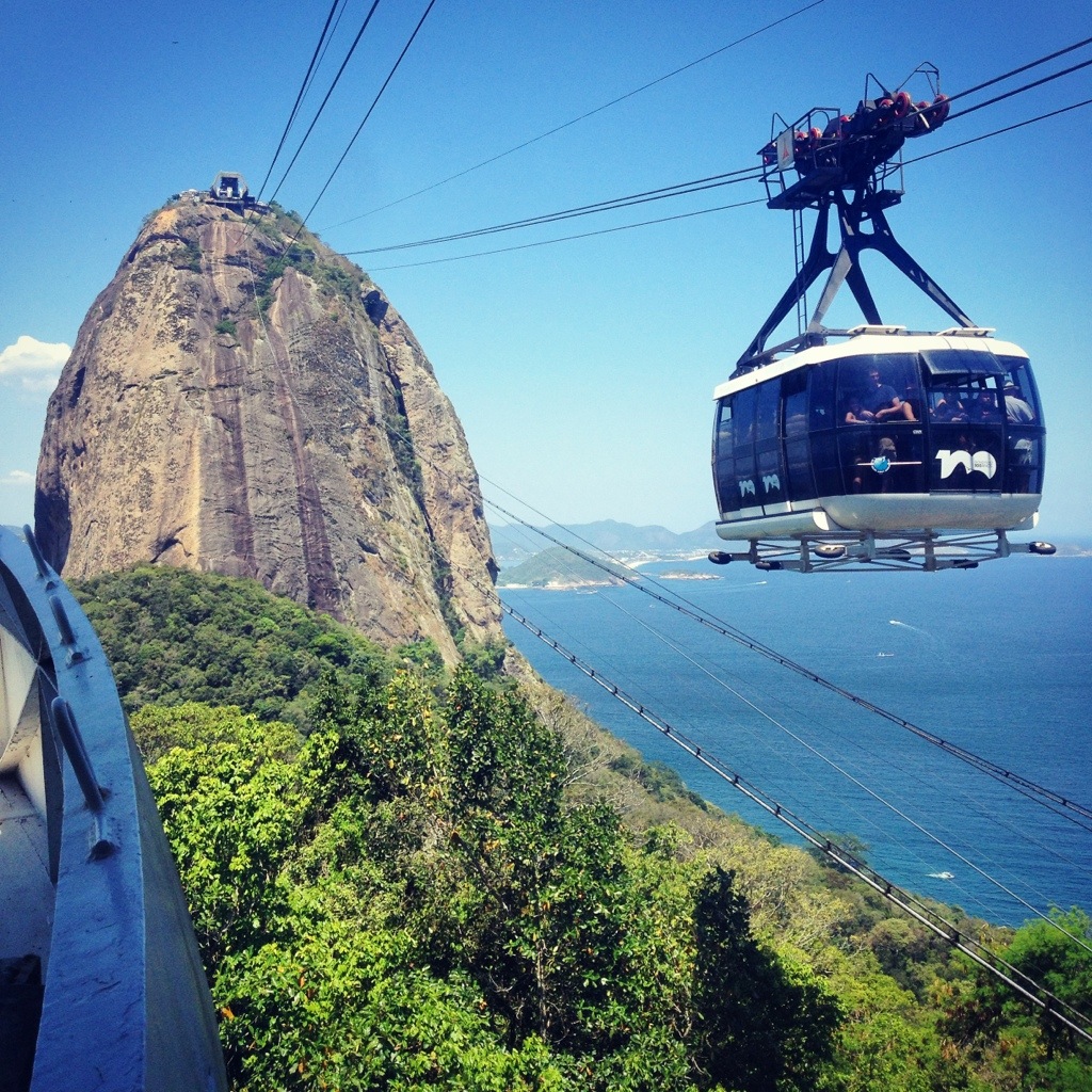 Resan upp till Sockertoppen sker i två etapper. Först linbana upp till Morro da Urca där restaurangen finns och redan där är utsikten fantastisk. Därefter väntar resan upp på själva sockertoppsberget. Den där linbaneresan som ser så halsbrytande ut. Men det är inte alls så läskigt som det ser ut nerifrån. Utsikten gör att jag glömmer att vara rädd!