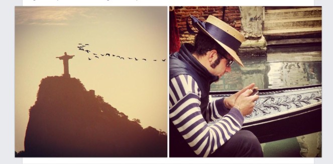 Bilderna jag la upp har jag visat här förut. En väl inzoomad bild av ett fågelsträck framför Jesusstatyn i Rio. Fotograferad från hotellterass med takpool. Motljus vid solnedgången. Men den lite rörigare förgrunden närmast hotellet med hustak och tv-antenner är bortbeskuren. Det är lite av en reklambild. Den andra bilden visar väl inte direkt någon baksida men väl på en kontrast mellan det turistiskt tillrättalagda och verkligheten. Och också mellan gammalt och nytt. Den visar en gondoljär i Venedig som surfar på sin mobiltelefon.