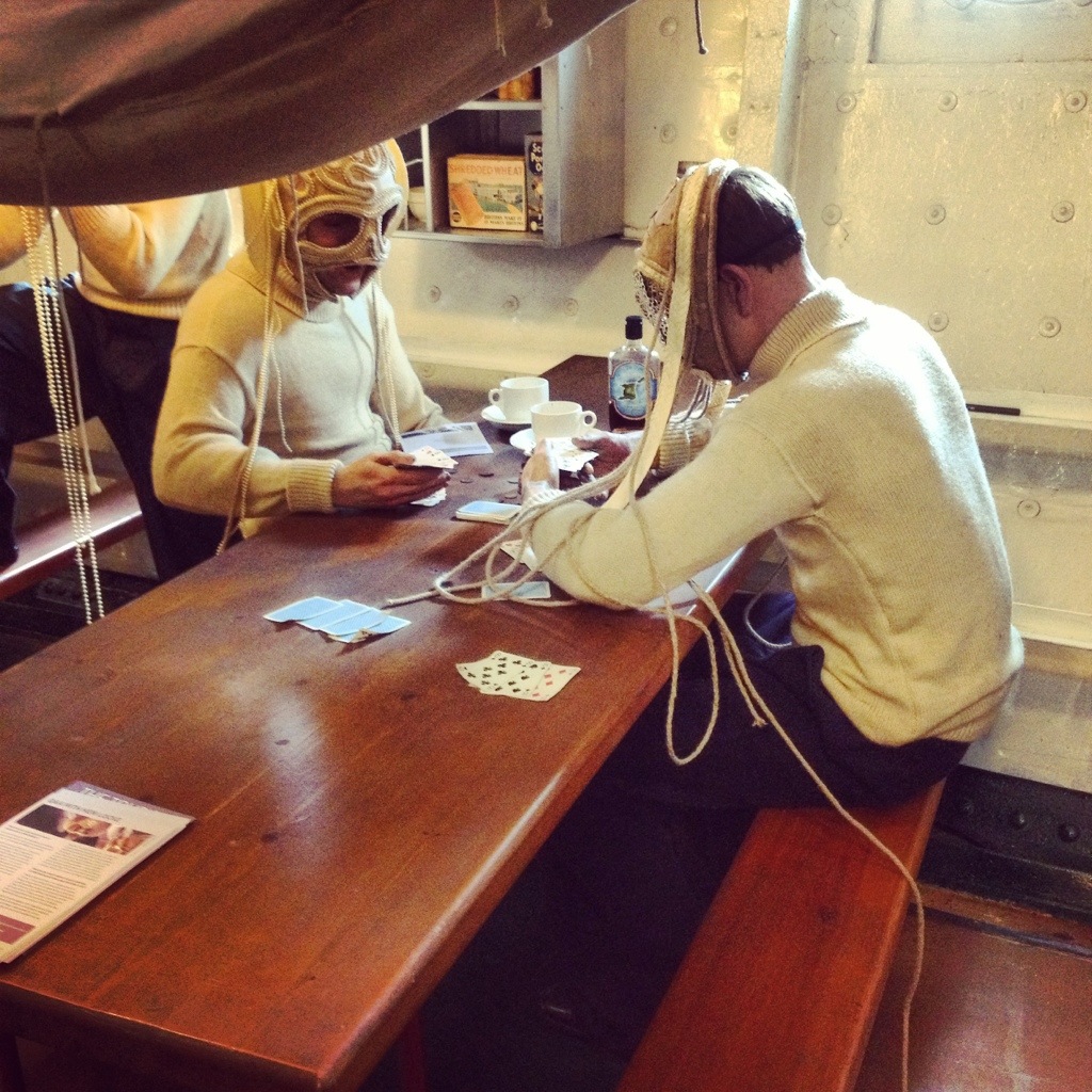 Men när jag nu i efterhand googlar finner jag att konstnären, Hew Locke, inspirerad av HMS Belfast sista internationella resa genom Västindien 1962, skapat en alternativ historia där besättningen deltar i Trinidads karneval. De masker och tatueringar som den ordinarie utställningens dockor försetts med ska representera rädsla och hopp. Men lite tokrolig är installationen allt. Tycker jag nog.