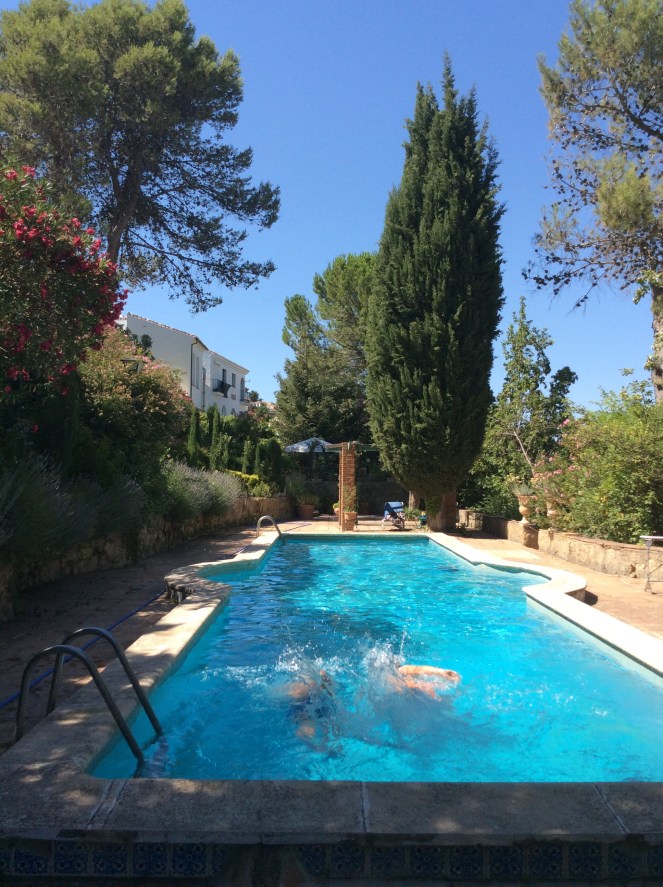 Vid 12-tiden idag lämnade vi Ronda efter frukost i hotellträdgården och ett morgondopp i poolen (jag och minstingen). Vi bodde en natt på mysiga Jardin de la Muralla. (Poolbilden är ifrån igår eftermiddag när båda pojkarna simmade i poolen.)