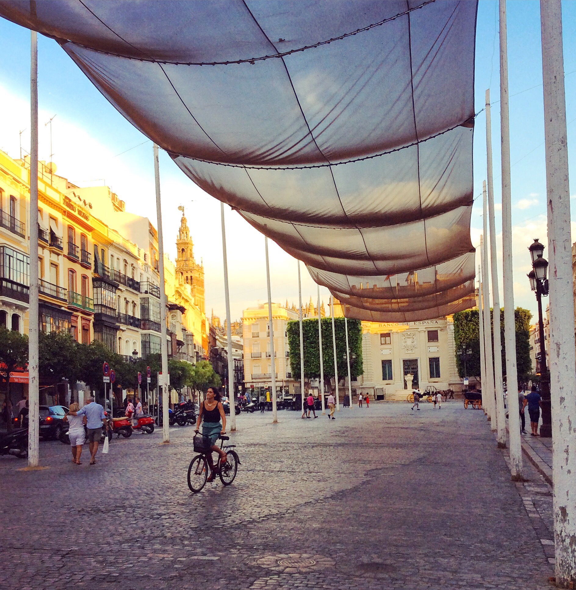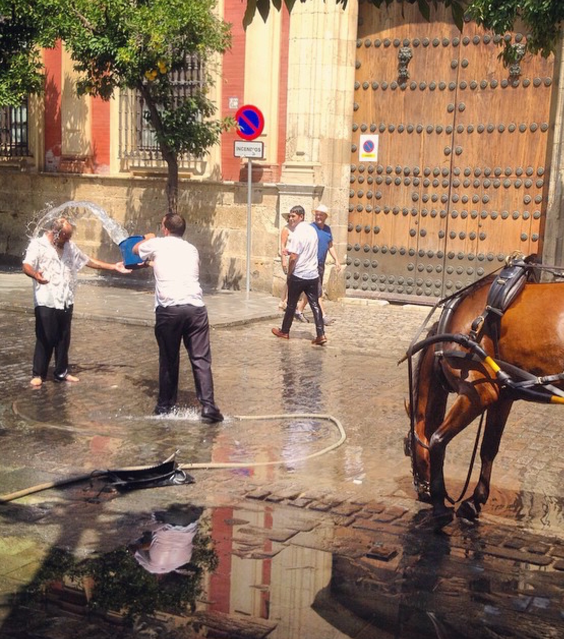 Det är hett i Sevilla på sommaren. Några droskförare svalkade sig själva och varandra med vatten ur slang och spann. Vi låg i poolen på eftermiddagarna. Inte vid. Utan i.