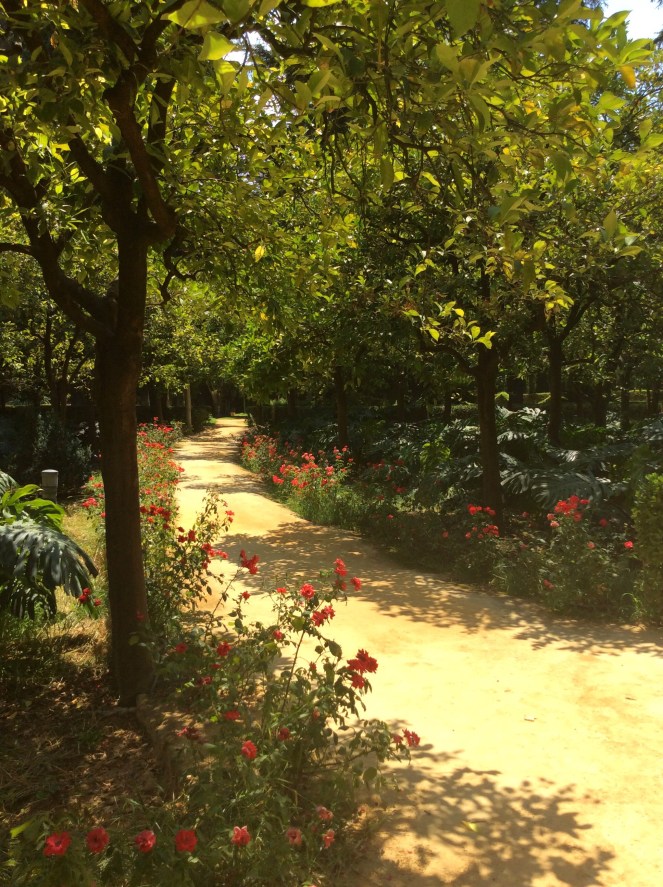 Jo. Jag ville se Sevilla. Och nu har jag sett. Men vad såg jag? Jag såg en rest av en ringmur, en flod, en tjurfäktningsarena, en katedral och ett moriskt slott. Och en slottsträdgård med mer än en röd ros. (”Det finns en ros i Sevilla, röd i månens sken…”)  Jag åkte hästdroska och sightseeing-buss. (Den senare kan ni lika gärna skippa. Trots guidning även på svenska. Den kommer inte in till de flesta sevärdheterna.)