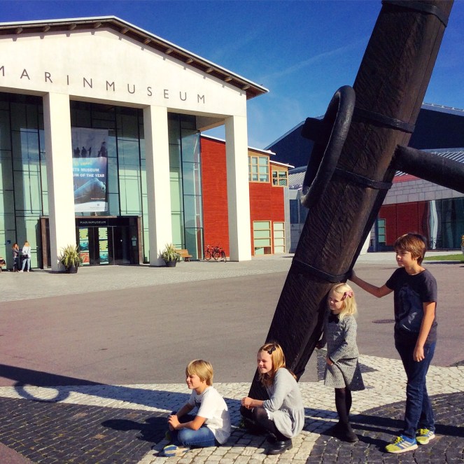 Min bror med familj är på besök så det är fyra kusiner som poserar tillsammans vid Marinmuseet.