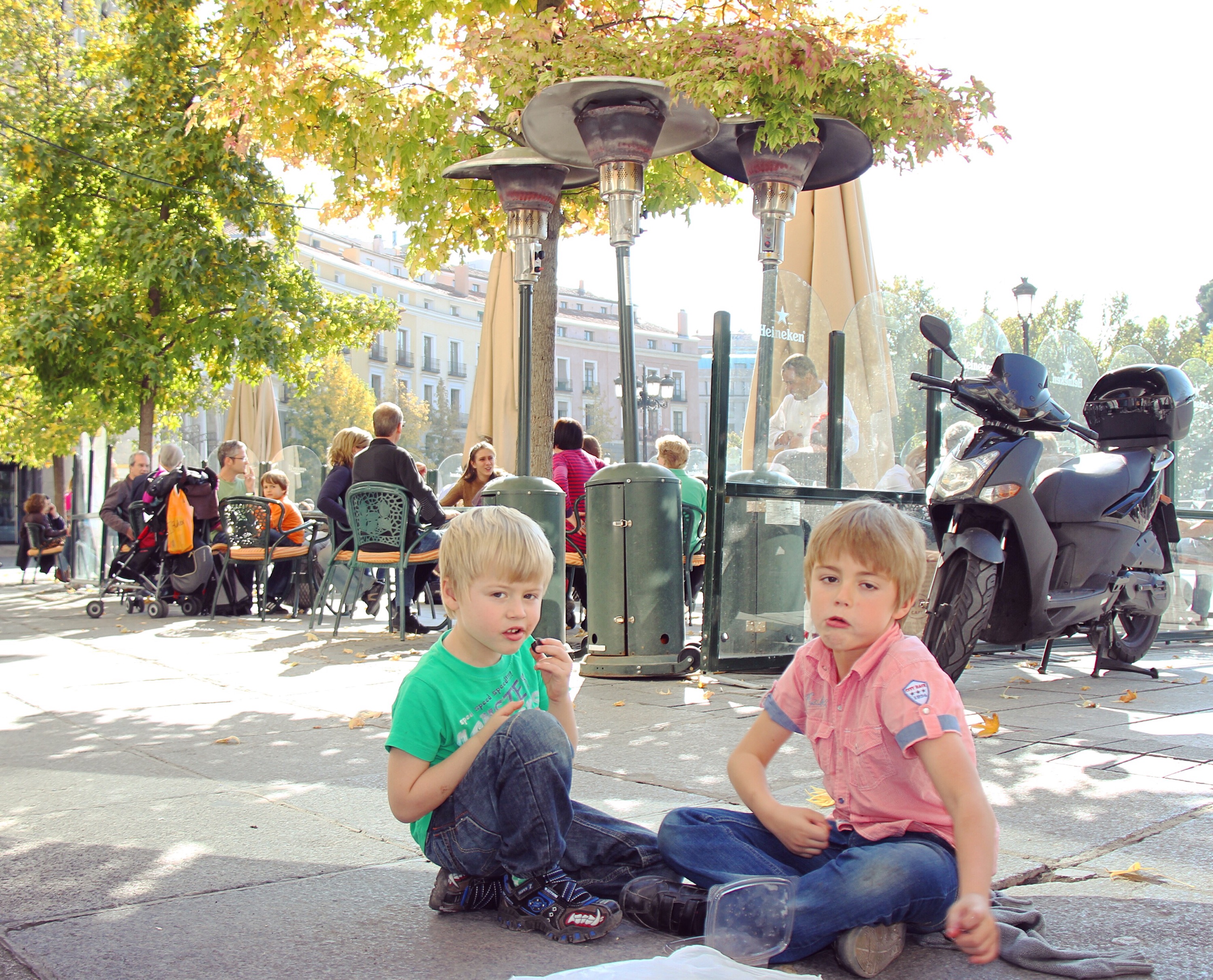 Det visade sig vara ett utmärkt val för en höstlovsresa. Vädret var behagligt för utomhusaktiviteter och den spanska huvudstaden hade mycket spännande att visa upp. För fyra år sedan var våra barn fortfarande så små att de också uppskattade att leka en stund på varje lekplats vi passerade och då kunde vi föräldrar sitta på en bänk i solen och småprata medan barnen lekte av sig. Redan då älskade de oliver och jag minns ett tillfälle då de satte sig på marken, sedan de ätit lunch, och åt inköpta oliver direkt ur burken som om det vore godis. Detta medan vi vuxna satt kvar vid bordet och drack te och kaffe. Restaurangen låg intill det kungliga slottet.