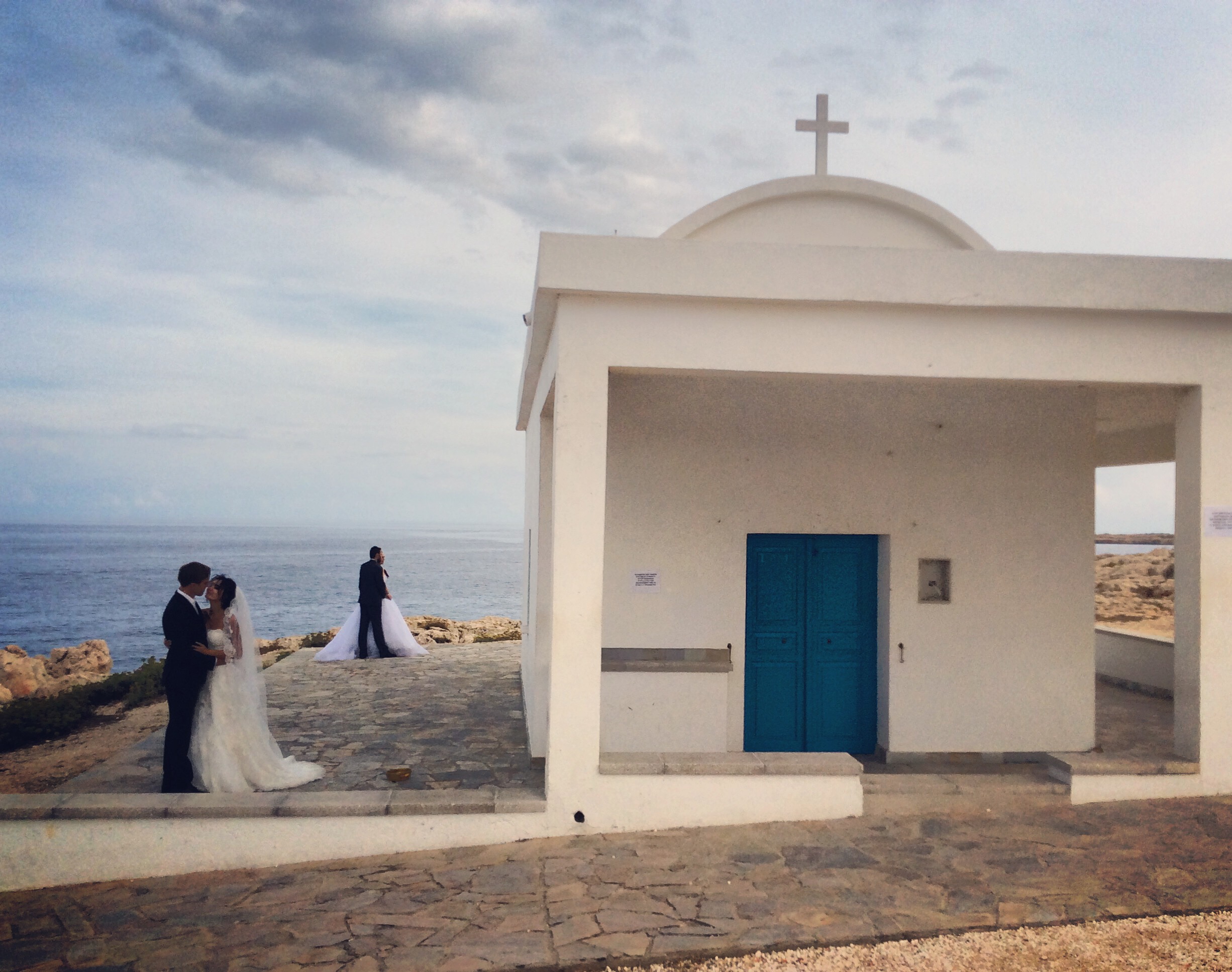 Efter en stund kommer vi till ett litet kapell. Flera brudpar är där för fotografering. Katter är där också. Vi går ner för en trappa mot havet och hittar en liten grotta. Det har mulnat på.
