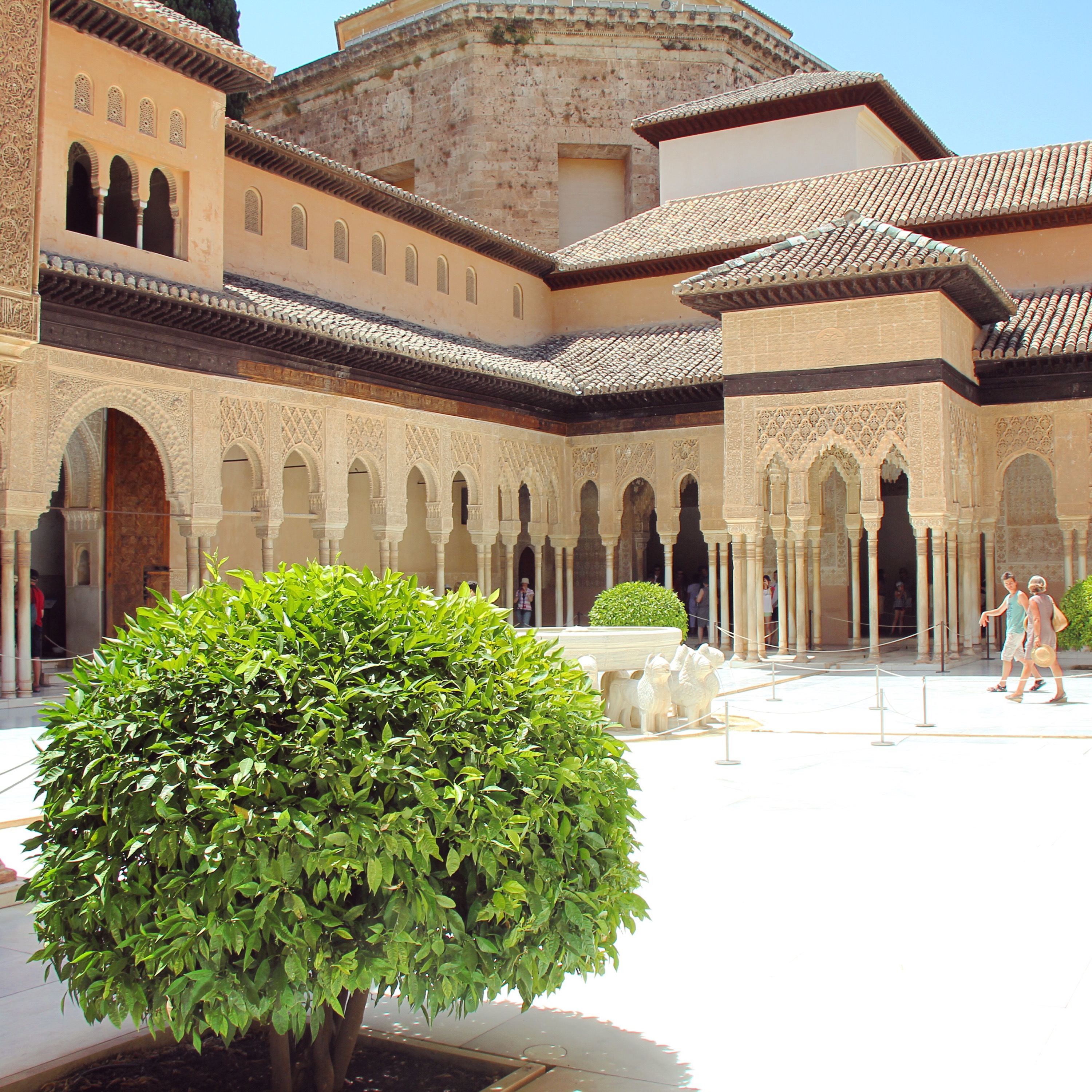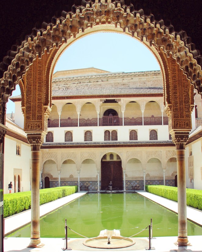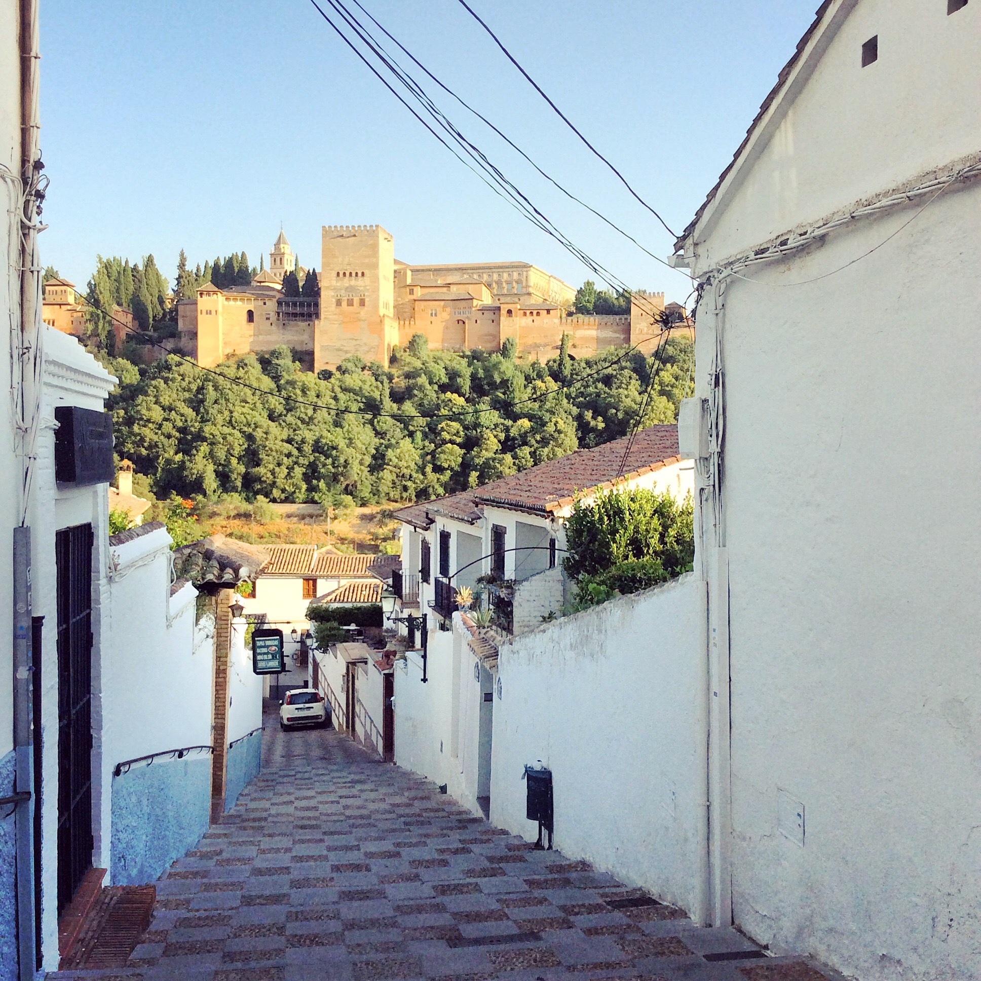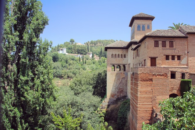 Alhambra ligger högt uppe på en klippa och ser ganska enkelt och anspråkslöst ut på utsidan, ungefär som man skulle kunna förvänta sig av en borg från 1200- och 1300-talen. Men insidan är häftigare. Palatset syns från stora delar av Granada.