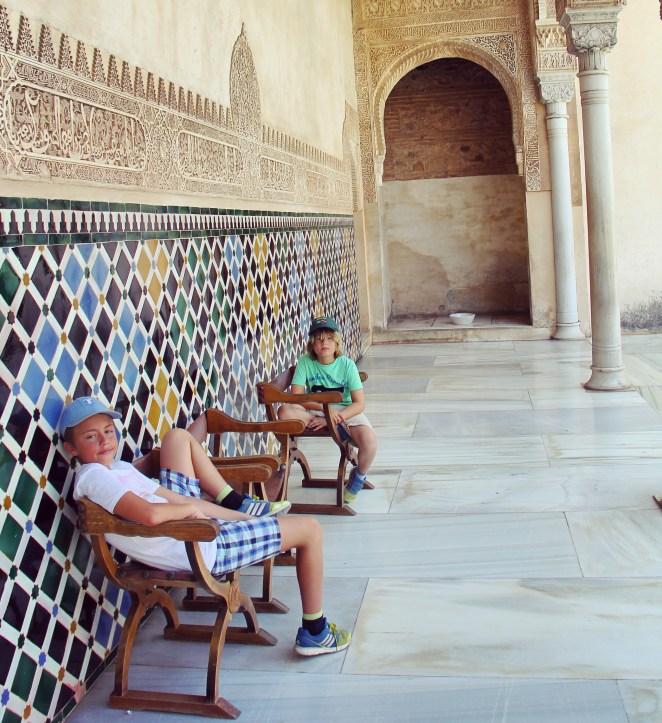 I och med de fasta tiderna uppstår köer vid insläppet. Ett råd är att ta med en guidebok att läsa i kön. Eller gör som jag: jag tog några skärmdumpar på Wikipedia-sidor om Alhambra och morerna. Jag läste högt för barnen om ”morens sista suck” när Boabdil, den siste moriske härskaren, lämnade Alhambra 1492, vände sig om och såg sitt undersköna palats för sista gången. Barnen reagerade särskilt på att Boabdils mor anklagade honom: ”… att gråta som en kvinna över det du inte kunde försvara som en man!”