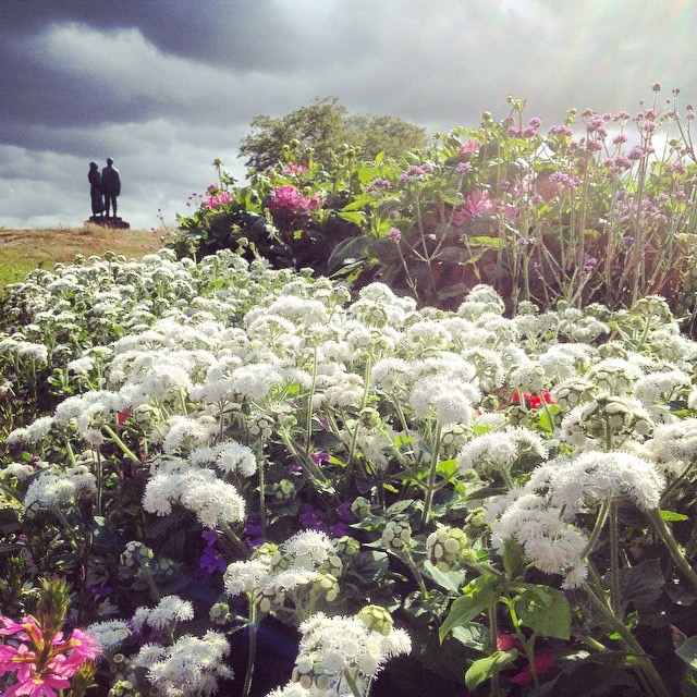 Juli. Parkblommor vid Näsviken i Karlshamn med utvandrarstatyn i bakgrunden fick 151 gilla-hjärtan trots, eller kanske tack vare, de hotfulla molnen i bakgrunden.