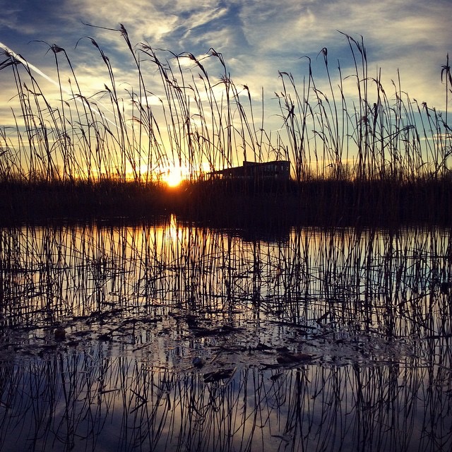 Februari. I Kristianstad finns naturen och Vattenriket mitt i stan. Solen går ner vid naturum som syns genom vassen från stadsparken som heter Tivoliparken. 146 gillade bilden.