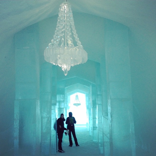 Det sagolika. En byggnad av is och snö. Vattnets turkosa färg igen. Men den här gången i form av is. Två människor som silhuetter. Och två fantastiska kristallkronor av is. Ishotellet i Jukkasjärvi. Och igen: 129 gillade bilden på Instagram.