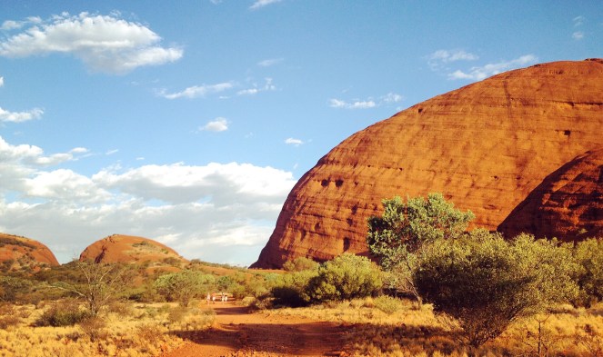 Kata Tjuta, även känd som The Olgas är en grupp av stora, rödtonade klippformationer i södra Northern Territory, Australien. Klipporna ligger 2,5 mil väster om Uluru , som i sin tur också kallas Ayers Rock. Jag har skrivit om den Klippan tidigare under rubriken: ”Vad är grejen med Uluru / Ayers Rock?” Båda sevärdheterna ligger i samma nationalpark: Uluru – Kata Tjuta National Park. Den som besöker nationalparken flyger till och bor i Yulara. Flygresan tar ungefär tre timmar från Sydney.