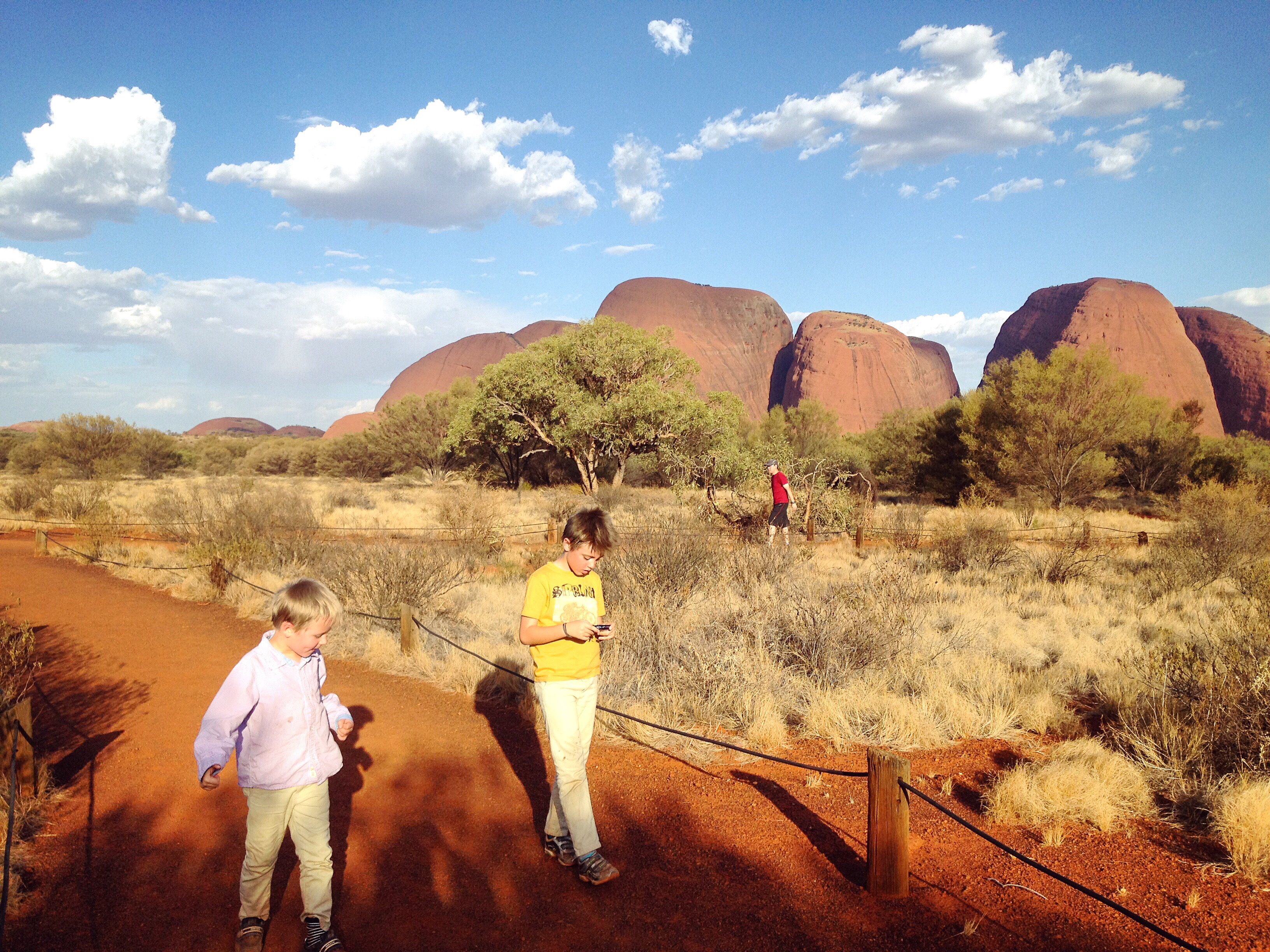 Väl framme gick vi en kortare sväng innan pojkarna tyckte att det var för varmt och ville vila. Jag frågade om det var okej att jag gick en liten bit längre på egen hand. Jag ville så gärna se mer! Det var det. Pojkarna och Anders stannade i skuggan under ett träd och jag vandrade en liten sväng längs en av lederna innan jag vände. När jag kom tillbaka ramlade en sula av från en av mina skor. Det visade sig att även den andra skons sula satt lös. Jag upptäckte att det var limmet som sulorna var fästa med som hade smält i värmen! Tillbaka på hotellrummet var det bara att kasta skorna. Men Kata Tjuta är en upplevelse som jag inte skulle vilja vara utan! Så här i efterhand kan jag till och med tycka att Kata Tjuta känns ännu mer värdefullt att ha sett än Ayers Rock.