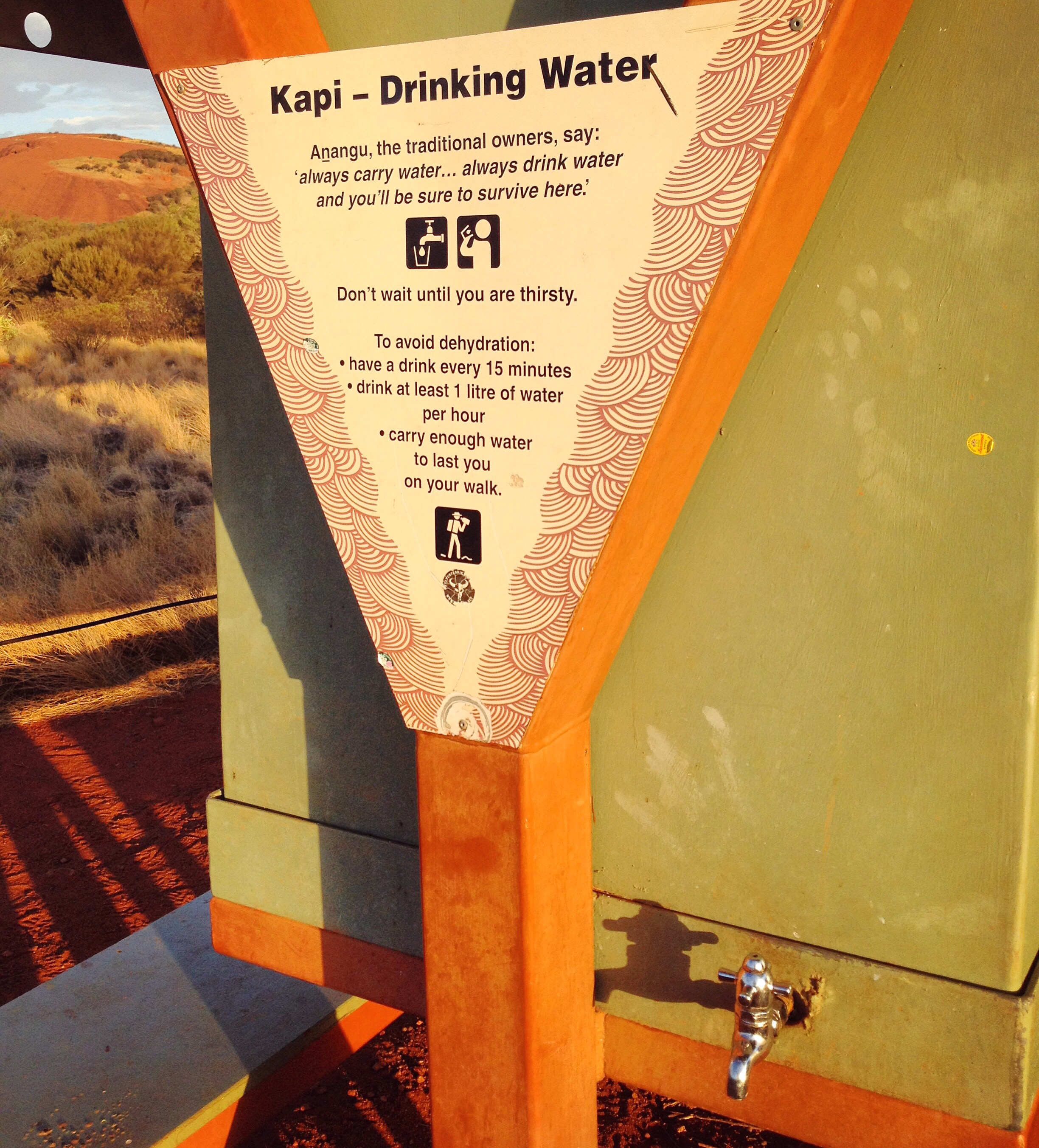 Vi hade tre nätter i Yulara. Många guideböcker rekommenderar besök i nationalparken i soluppgången men vi ville inte gå upp så tidigt. Vi valde istället att tillbringa dagarna i Yulara, i skuggan och mest i poolen. Och faktiskt en del inne på det luftkonditionerade rummet. 46 grader i skuggan och strålande solsken på det kan bli lite väl bra! På kvällarna var det lika varmt på termometern men solstrålningen tog mindre. Kväll två hade vi besökt Uluru och kväll tre var det dags för Kata Tjuta. Ta med vattenflaskor! Du förlorar massor av vätska i hettan. Det finns möjlighet att fylla flaskorna med mer vatten på plats om det behövs. Men var beredd på att det vattnet är lika varmt som omgivningen.