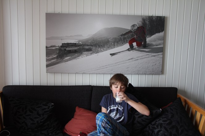 Bilderna. Överst och direkt här nedanför: utsikt från balkongen. Längst ner: Min äldsta son dricker mjölk i soffan i köket. På väggen en tavla med utsikt mot lapporten.