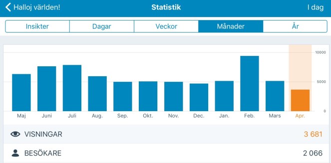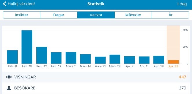 En sak som är tydlig är att sedan jag gick med i utmaningen #blogg100, att publicera ett inlägg om dagen i hundra dagar, har statistiken gått ner. Jag vet inte om det mest beror på sjunkande kvalitet när jag skriver ofta eller om det beror på att jag får mindre tid att posta länkar till blogginläggen i olika sociala medier. Hur som helst såg jag samma mönster förra året. Jag tänker ändå försöka klara den här utmaningen. Det är lite det att utmana mig själv att skriva även när andan inte faller på som är utmaningen. Som en del i att utveckla mitt skrivande. Jag gör det alltså inte för att få fler läsare på kort sikt utan för att bli en bättre skribent på längre sikt. Om det sen fungerar så återstår väl att se.