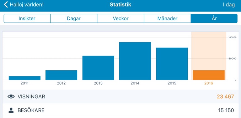 En annan sak som är tydlig är att sedan bloggen nystartade på wordpress.com i maj 2011 så ökade antalet besökare och sidvisningar år för år till och med 2014. Sedan sjönk det tillbaka något. Tror på att det beror på att jag orkade blogga ovanligt sällan andra halvåret 2015.