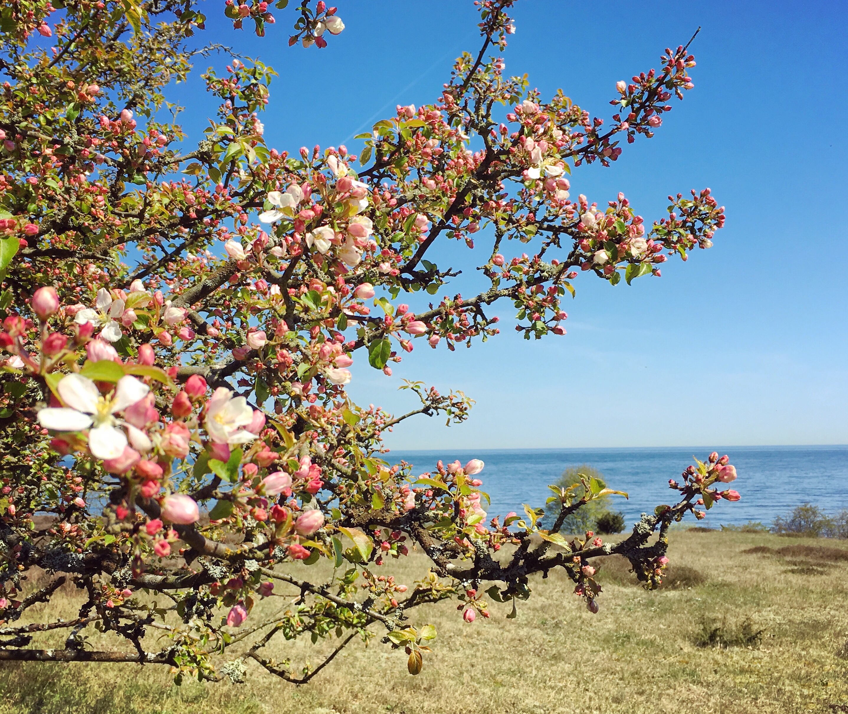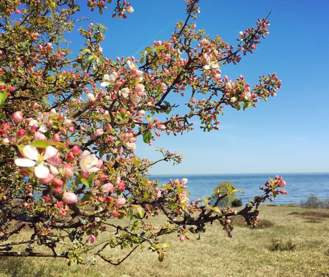 Sedan i hagarna ner mot havet fler körsbärsträd och en ensam vildapel. Ängar med gullvivor. Små smörblommor som redan lyser som gula solar. En och annan maskros också, så klart. Kabbeleka vid en porlande bäck. Mandelblom. Och längst nere vid havet blommar mängder med backsippor ännu. Det är så vackert att du dånar.