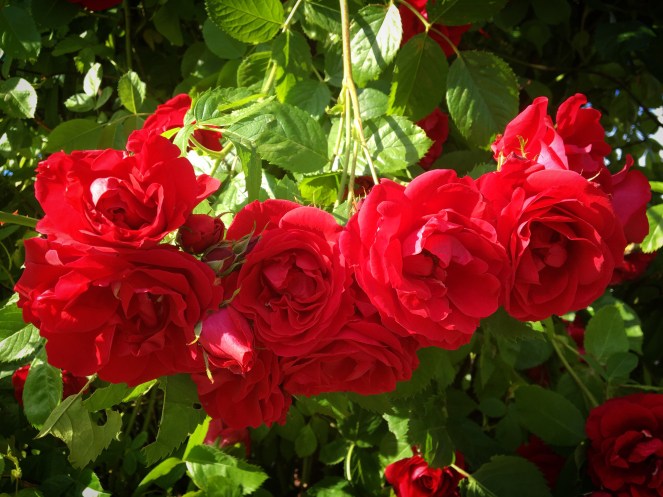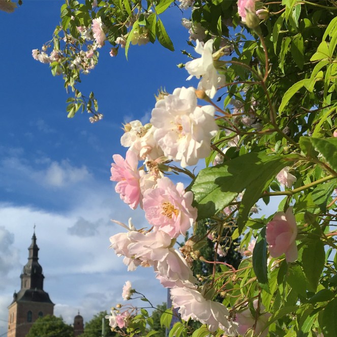 Mellan Tivoliparken och Barbacka, Tivolibadet och järnvägen finns en parkyta full av klängande rosor. De blommar i full prakt just nu. De ligger precis intill promenadstråket från parkeringsplatsen vid Vattenrikets naturum in mot centrala Kristianstad. Mellan Helge Å och handelsstaden.