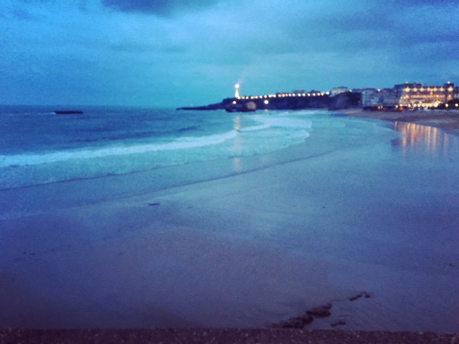 När jag nu ligger där på stranden, tittar på molnen och konstaterar att det inte kommer att klarna upp har jag ändå tagit två dopp i havet som i och för sig inte var varmt men heller inte kallt. Jag fryser inte trots våt hud som torkar i vinden. Det är ganska varmt i luften, trots allt. Medan huden långsamt torkar tänker jag på Biarritz. Hur det kom sig att det blev en turistort tack vare att Napoleon III kom att välja just denna plats, som då var en fiskeby i naturskönt läge med vackra stränder, klippor, raukar, höga turkosa vågor och solnedgångar i havet. Han semestrade här på 1850-talet och lät bygga en sommarvilla åt sin kejsarinna Eugénie. Hon tillbringade sedan några semesterveckor här varje sommar då hon seglade, badade och umgicks informellt med privata vänner och delar av sin familj. Bland annat passade hon på att träffas och umgås med sin mamma och sin syster som helst inte fick visa sig offentligt i Paris.