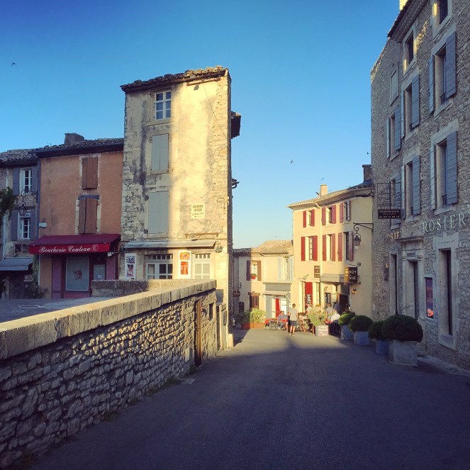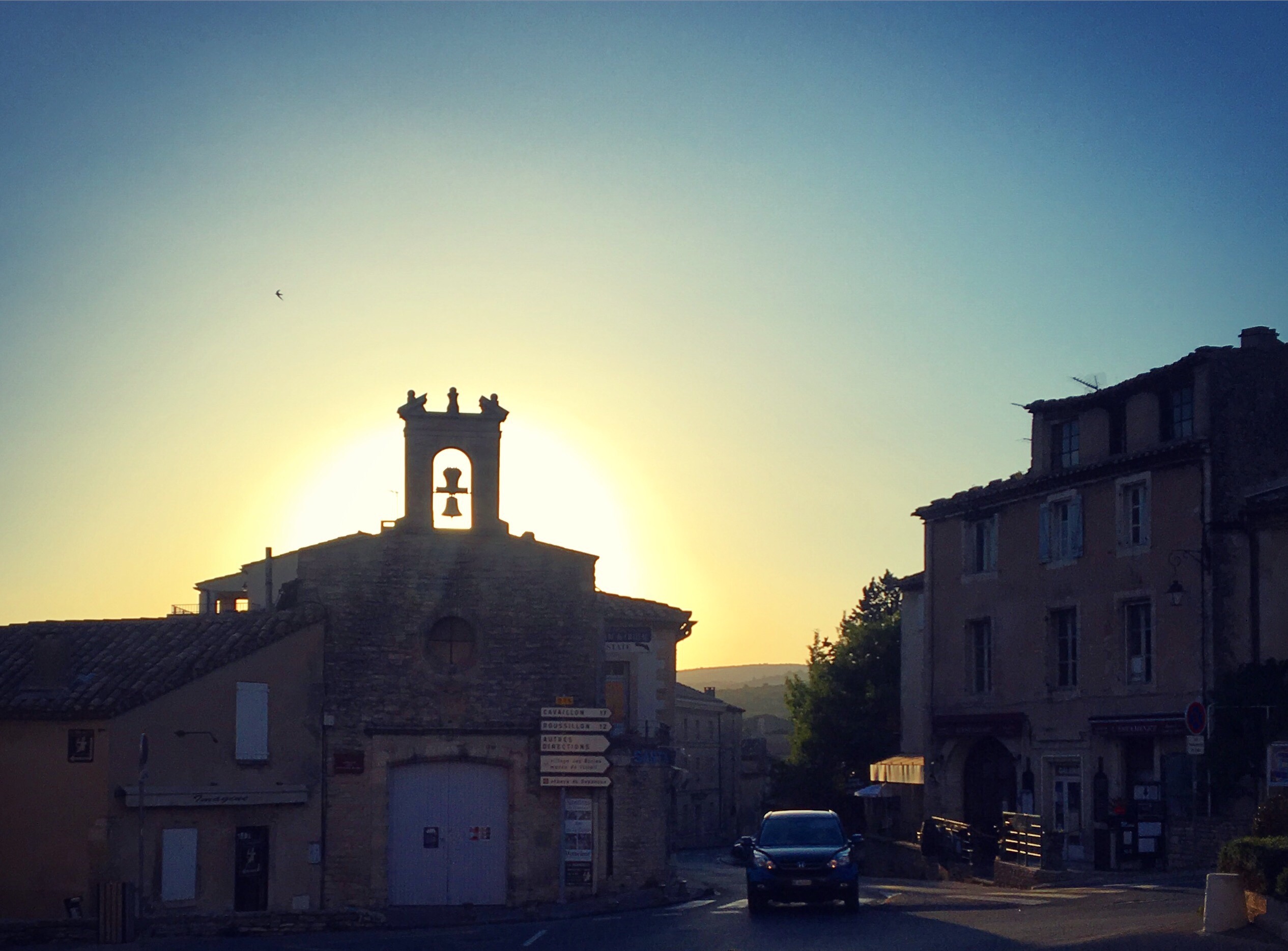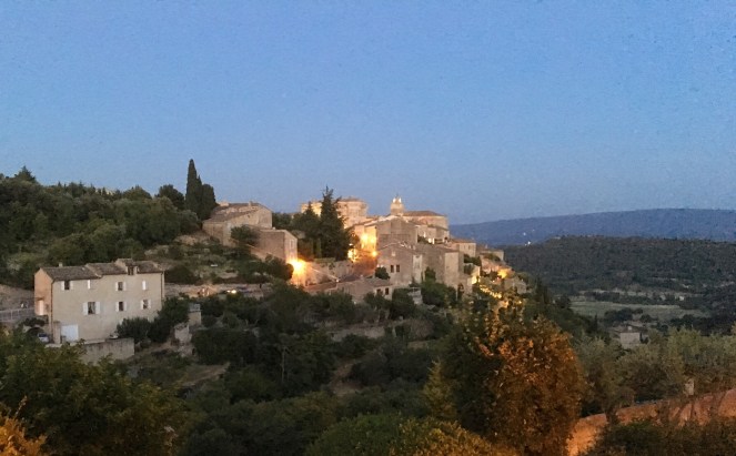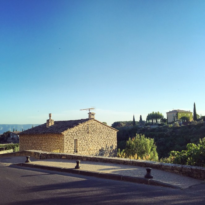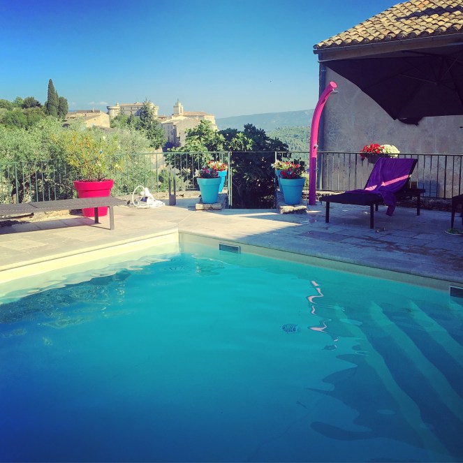 Poolområdet har fin utsikt över byn Gordes som ligger vackert där på sin klippa. Cikadorna ljuder och påminner om att vi nu kommit till en ny klimatzon. Det syns också på växtligheten. Och känns på värmen. Värmen mötte vi i och för sig – något oväntat – redan i Andorra, där nog Pyrenéerna annars lite har sitt eget klimat. Kallare än Medelhavets men varmare än Alpernas.