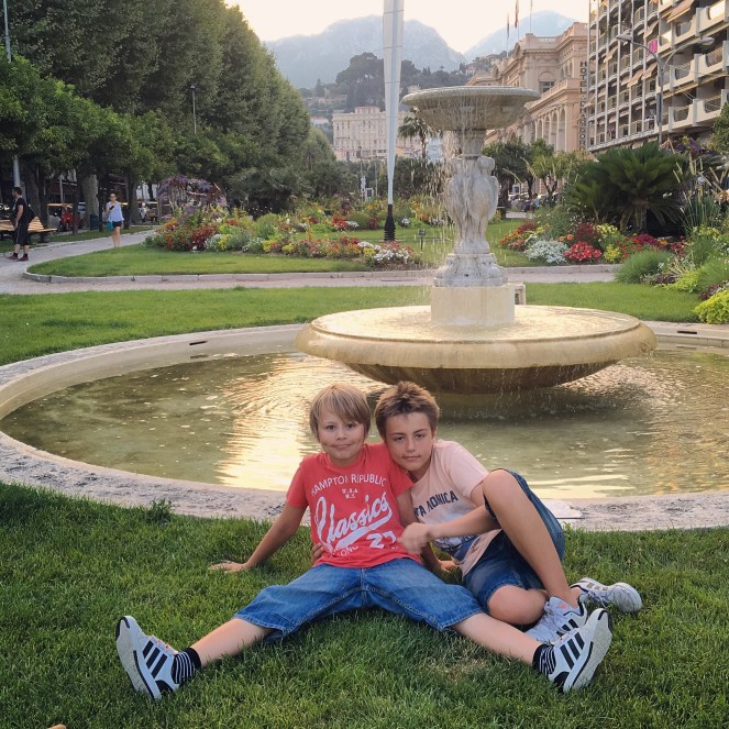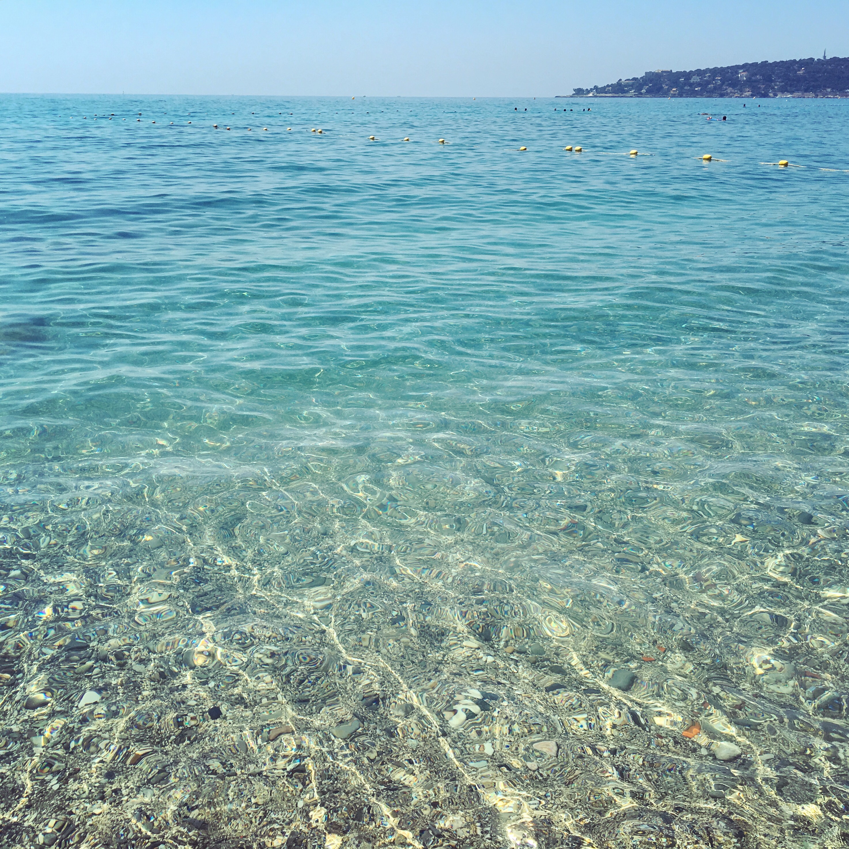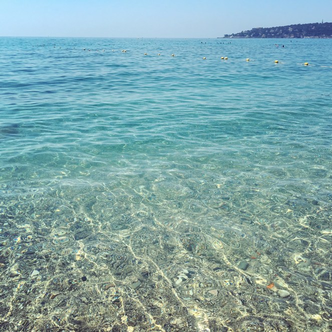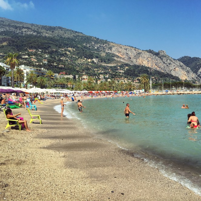Vi ligger i Medelhavets mjuka och ljumma vågor och guppar, tioåringen och jag. Det är mysigt och vi simmar ut en liten bit. Pratar om ditten och datten. Bland annat om en segelbåt vid horisonten som vi ser när vi guppar på vågornas topp men inte i vågdalarna. Tioåringen har på sig gula simglasögon. Jag har inga. Båda har badskor på fötterna. Vi tar ett sista kvällsdopp i Menton. Den sista lilla staden i det pärlband av städer som ligger längs den franska rivieran. Mellan Monaco och Italien ligger orten där vi semestrat i fyra dagar.