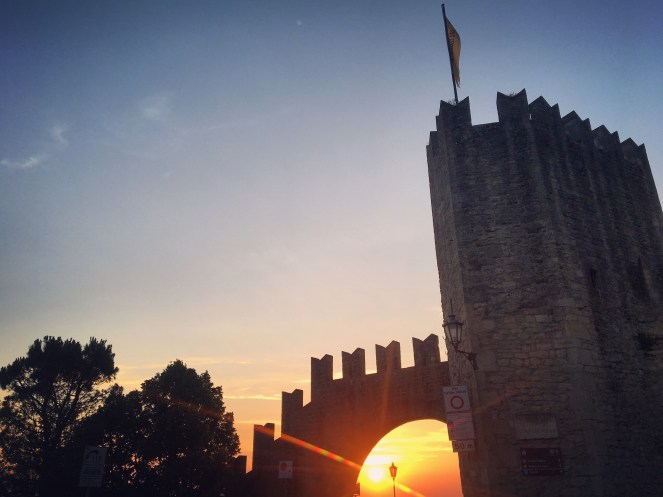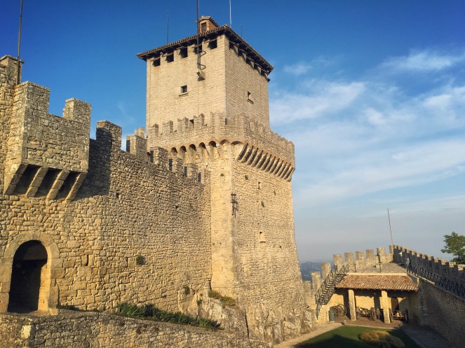 Efteråt äter vi kvällsmat med utsikt mot solnedgången. Jag tar lufttorkad skinka med melon. På vägen ner till hotellet passerar vi igen souvenirbutiker och fler restauranger. Hela stan känns faktiskt lite som en enda stor souvenirbutik. Men vi passerar också fler torn, ringmurar och försäljare i medeltida kläder. Stan är trots sin turistighet väldigt mysig. Och San Marino känns faktiskt på många sätt som ett ”riktigt” land trots sin litenhet och att det är helt omringat av Italien. Särskilt om du läst på lite om dess historia.