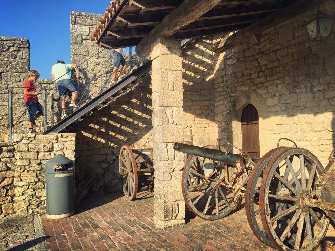 Vi står och beundrar utsikten från en av San Marinos borgar, Torre Guaita. Det är från 1000-talet och ska ha varit fängelse ända till 1970-talet. Nu är det museum. Vi kom in precis innan de stängde entrén. Jag fick i vart fall det intrycket av att kvinnan i biljettluckan såg skeptisk ut frågade: ”Är ni kvar i San Marino imorgon också?” när vi ville lösa biljett. Först när vi svarade nekande på den frågan avslöjade hon biljettpriset. Vi har med oss rabattkort vi fått på hotellet och när jag får biljetterna som är stadiga kort i hårdplast i kontokortsstorlek anar jag att orsaken till hennes fråga nog är att biljetterna gäller för entré på flera museer samma dag och att de alla stänger strax. Men ändå. Bara besöket i den här borgen är värt de 17 Euro vi betalar för hela familjen.