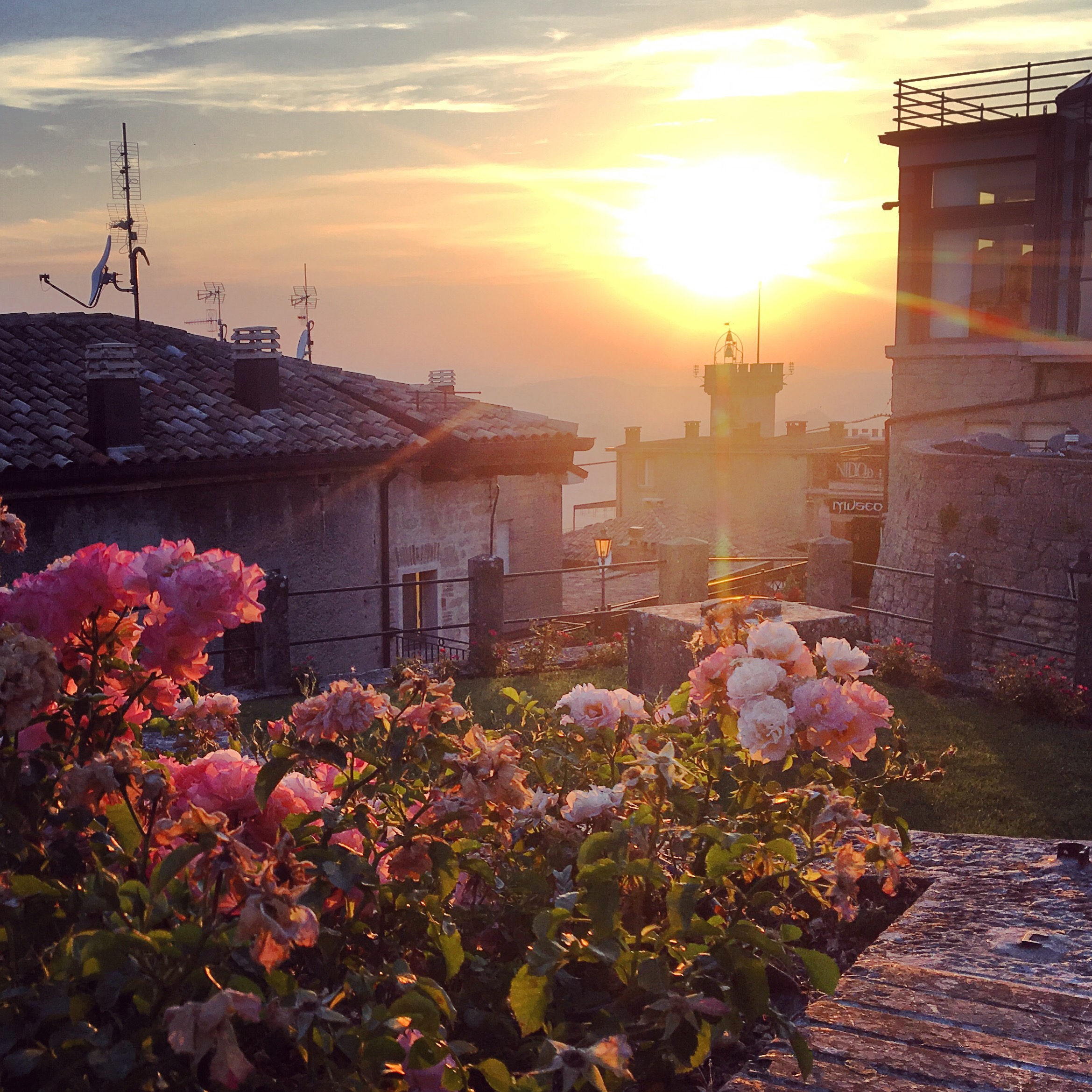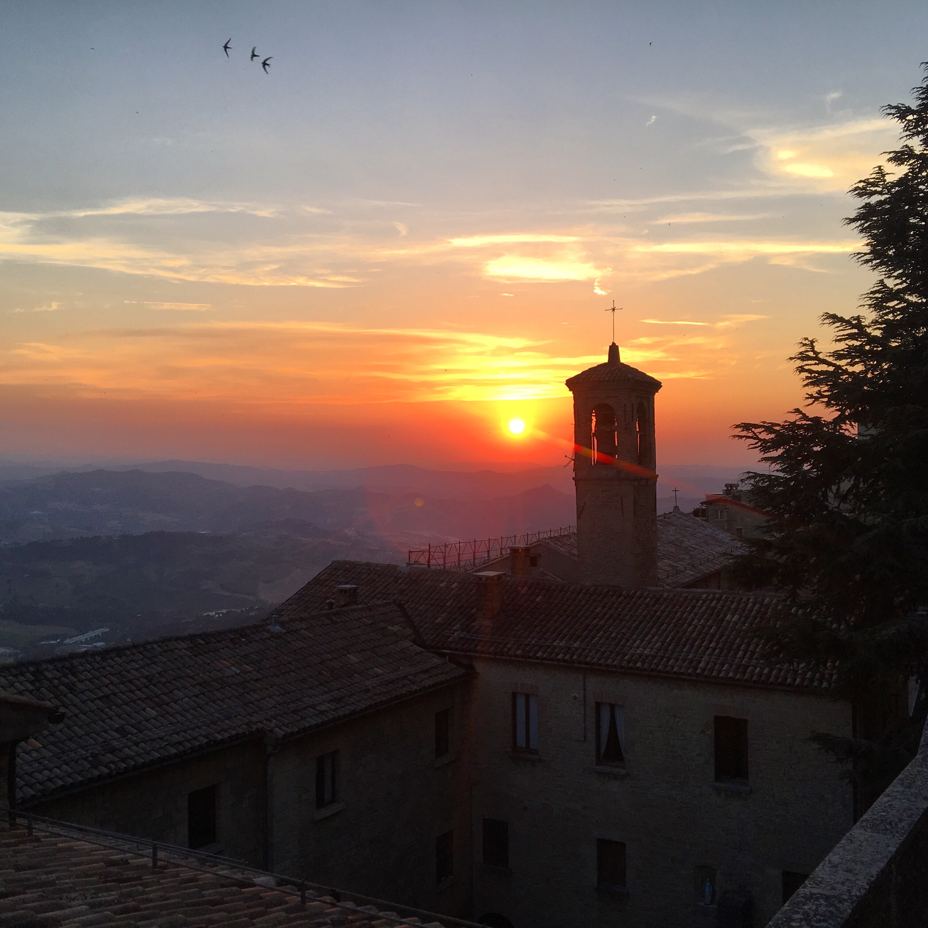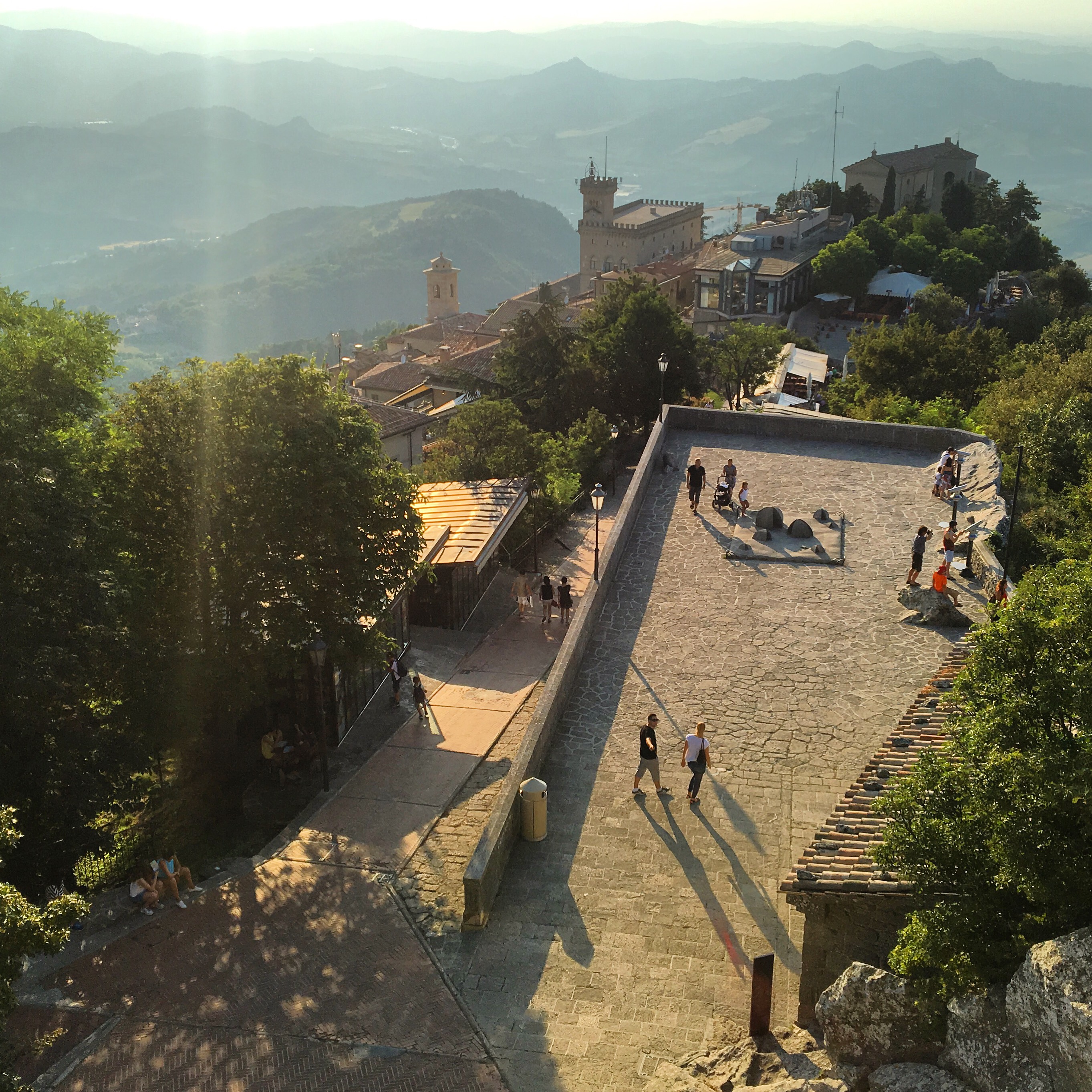 Efteråt äter vi kvällsmat med utsikt mot solnedgången. Jag tar lufttorkad skinka med melon. På vägen ner till hotellet passerar vi igen souvenirbutiker och fler restauranger. Hela stan känns faktiskt lite som en enda stor souvenirbutik. Men vi passerar också fler torn, ringmurar och försäljare i medeltida kläder. Stan är trots sin turistighet väldigt mysig. Och San Marino känns faktiskt på många sätt som ett ”riktigt” land trots sin litenhet och att det är helt omringat av Italien. Särskilt om du läst på lite om dess historia.